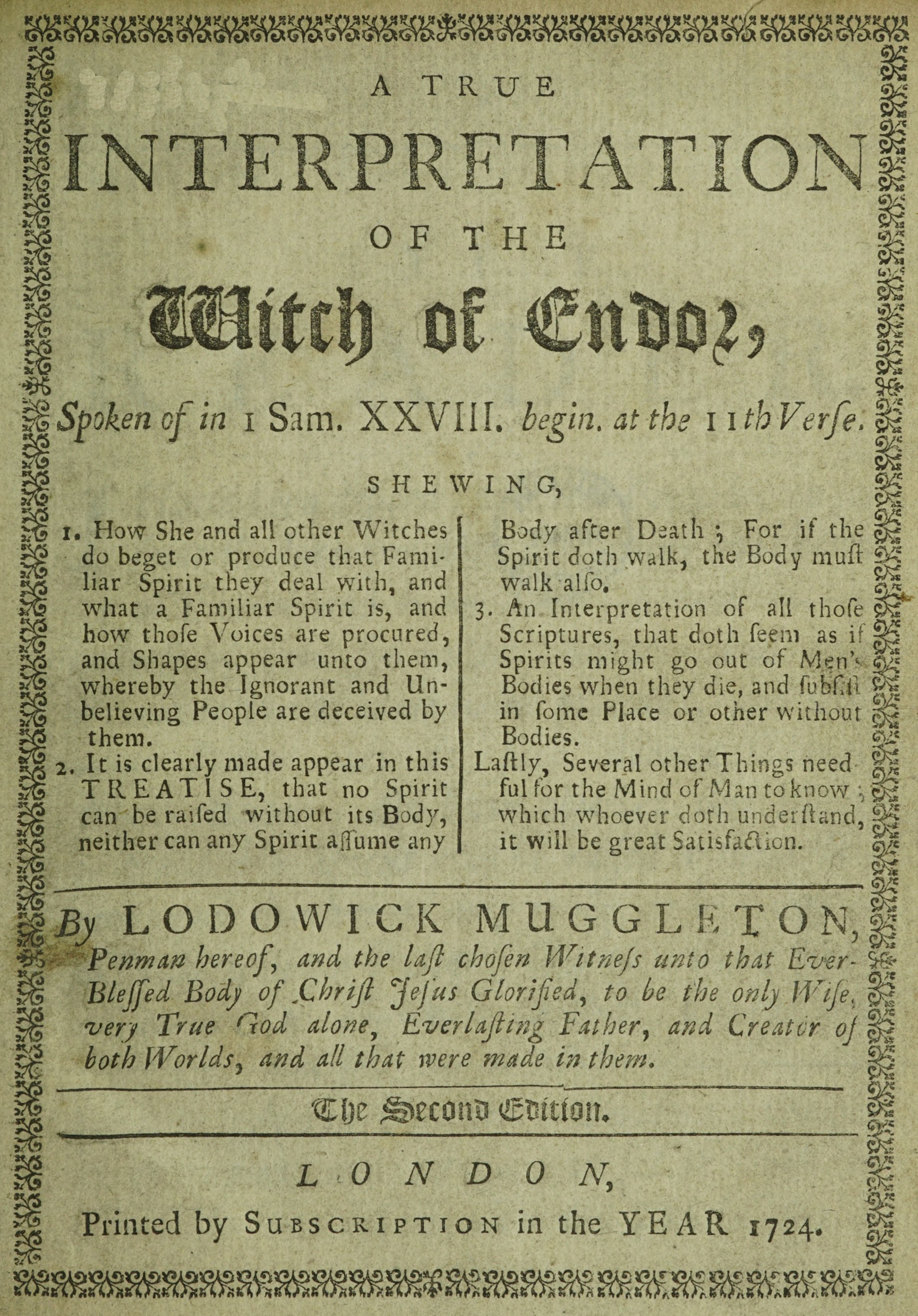 I Shall give the Interpretation, what is meant by that Familiar Spirit the Witch of Endor which did raise Samuel, so much spoken of in the Book of Samuel, and other Places of Scripture; and so much objected by many to prove that Spirits may be raised without Bodies, and may appear unto People in what Shape they please.