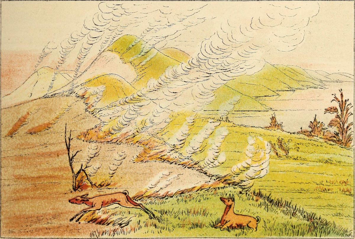 Red Thunder was on his feet!—his long arm was stretched over the grass, and his blazing eye-balls starting from their sockets! “White man (said he), see ye that small cloud lifting itself from the prairie? he rises! the hoofs of our horses have waked him! The Fire Spirit is awake—this wind is from his nostrils, and his face is this way!” No more—but his swift horse darted under him, and he gracefully slid over the waving grass as it was bent by the wind. Our viands were left, and we were swift on his trail. The extraordinary leaps of his wild horse, occasionally raised his red shoulders to view, and he sank again in the waving billows of grass. The tremulous wind was hurrying by us fast, and on it was borne the agitated wing of the soaring eagle. His neck was stretched for the towering bluff, and the thrilling screams of his voice told the secret that was behind him. Our horses were swift, and we struggled hard, yet hope was feeble, for the bluff was yet blue, and nature nearly exhausted! The sunshine was dying, and a cool shadow advancing over the plain. Not daring to look back, we strained every nerve. The roar of a distant cataract seemed gradually advancing on us—the winds increased, the howling tempest was maddening behind us—and the swift-winged beetle and heath hens, instinctively drew their straight lines over our heads. The fleet-bounding antelope passed us also; and the still swifter long-legged hare, who leaves but a shadow as he flies! Here was no time for thought—but I recollect the heavens were overcast—the distant thunder was heard—the lightning’s glare was reddening the scene—and the smell that came on the winds struck terror to my soul! * * * * The piercing yell of my savage guide at this moment came back upon the winds—his robe was seen waving in the air, and his foaming horse leaping up the towering bluff.