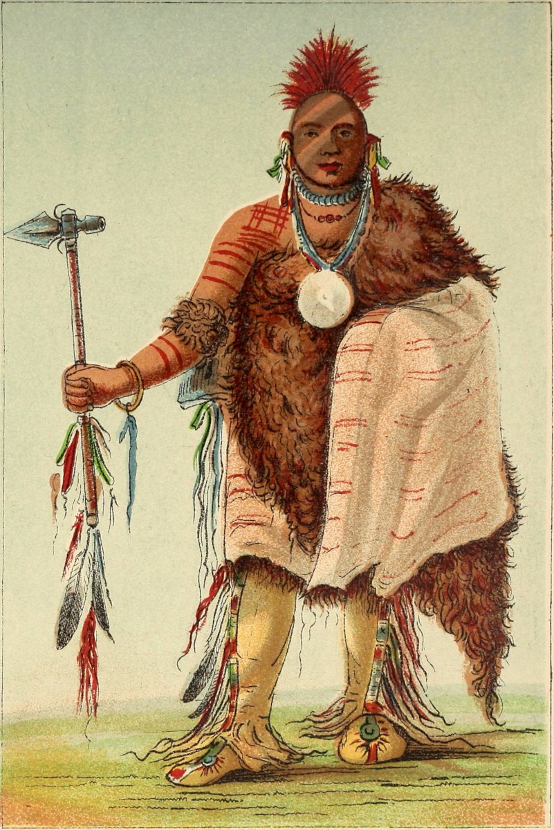 Pah-ta-coo-che (the shooting cedar, plate 131), and Was-com-mun (the busy man, plate 132), are also distinguished warriors of the tribe; tastefully dressed and equipped, the one with his war-club on his arm, the other with bow and arrows in his hand; both wore around their waists beautiful buffalo robes, and both had turbans made of vari-coloured cotton shawls, purchased of the Fur Traders. Around their necks were necklaces of the bears’ claws, and a profusion of beads and wampum. Their ears were profusely strung with beads; and their naked shoulders curiously streaked and daubed with red paint.