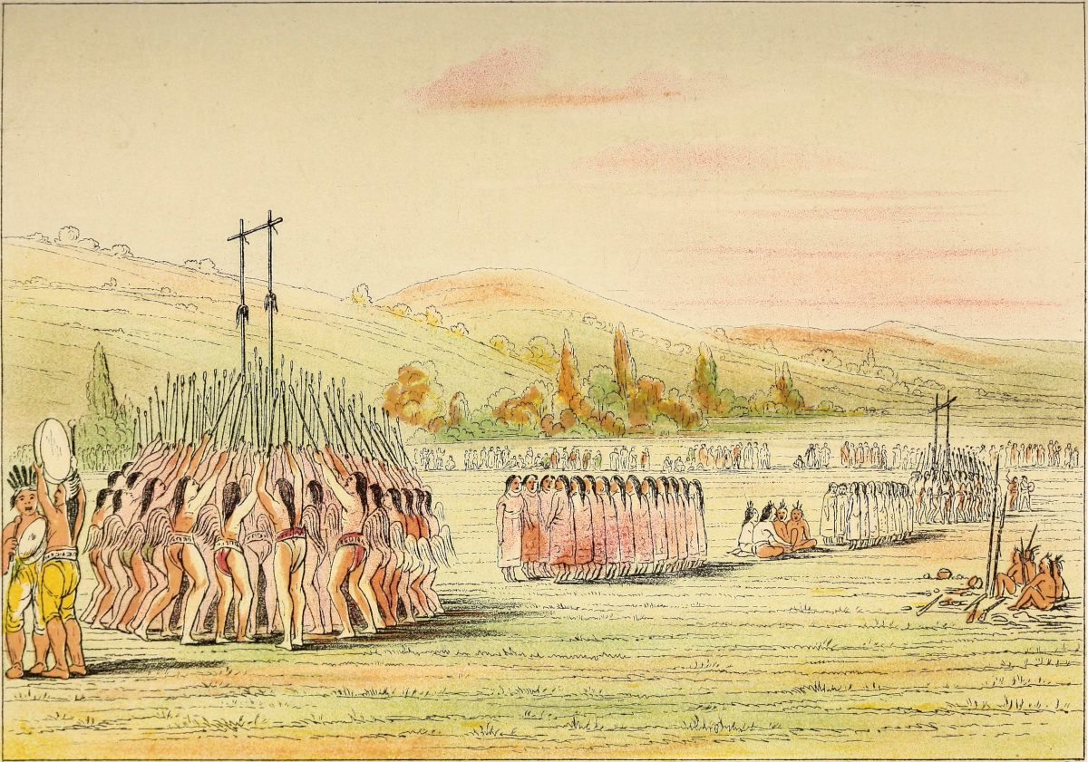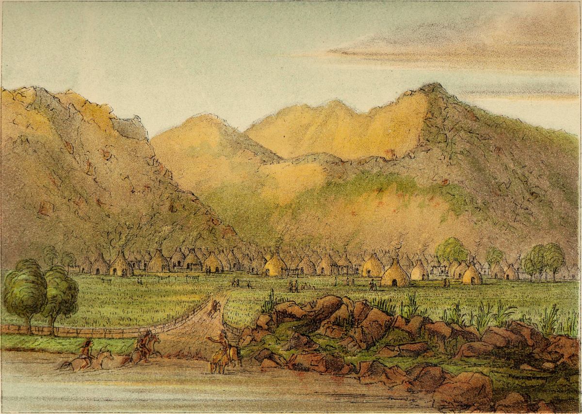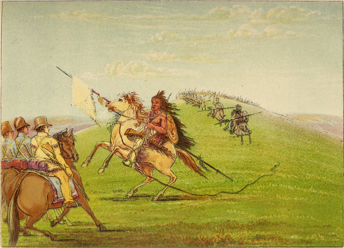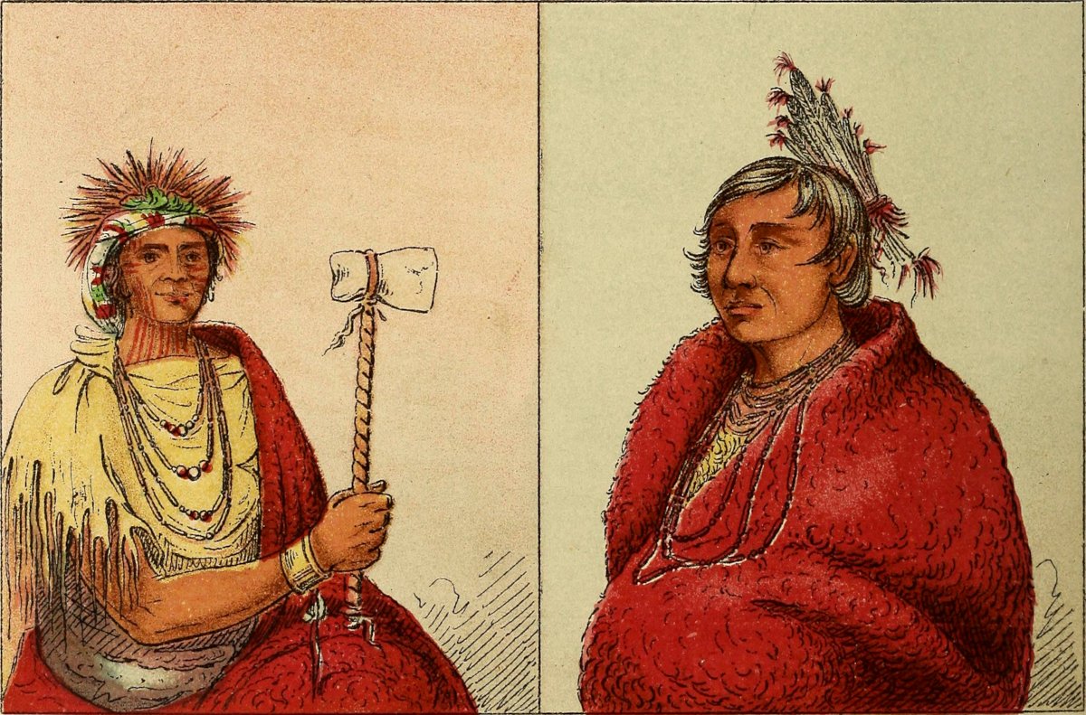 Since writing the last epistle, some considerable time has elapsed, which has, nevertheless, been filled up and used to advantage, as I have been moving about and using my brush amongst different tribes in this vicinity. The Indians that may be said to belong to this vicinity, and who constantly visit this post, are the Ioways—Konzas—Pawnees—Omahas—Ottoes, and Missouries (primitive), and Delawares—Kickapoos—Potawatomies—Weahs—Peorias—Shawanos, Kaskaskias (semi-civilized remnants of tribes that have been removed to this neighbourhood by the Government, within the few years past). These latter-named tribes are, to a considerable degree, agriculturalists; getting their living principally by ploughing, and raising corn, and cattle and horses. They have been left on the frontier, surrounded by civilized neighbours, where they have at length been induced to sell out their lands, or exchange them for a much larger tract of wild lands in these regions, which the Government has purchased from the wilder tribes.