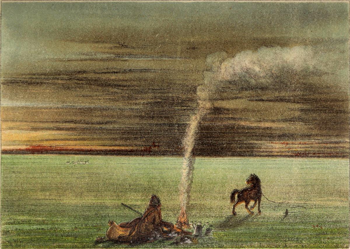 But there is yet another character of burning prairies (plate 128), that requires another Letter, and a different pen to describe—the war, or hell of fires! where the grass is seven or eight feet high, as is often the case for many miles together, on the Missouri bottoms; and the flames are driven forward by the hurricanes, which often sweep over the vast prairies of this denuded country. There are many of these meadows on the Missouri, the Platte, and the Arkansas, of many miles in breadth, which are perfectly level, with a waving grass, so high, that we are obliged to stand erect in our stirrups, in order to look over its waving tops, as we are riding through it. The fire in these, before such a wind, travels at an immense and frightful rate, and often destroys, on their fleetest horses, parties of Indians, who are so unlucky as to be overtaken by it; not that it travels as fast as a horse at full speed, but that the high grass is filled with wild pea-vines and other impediments, which render it necessary for the rider to guide his horse in the zig-zag paths of the deers and buffaloes, retarding his progress, until he is overtaken by the dense column of smoke that is swept before the fire—alarming the horse, which stops and stands terrified and immutable, till the burning grass which is wafted in the wind, falls about him, kindling up in a moment a thousand new fires, which are instantly wrapped in the swelling flood of smoke that is moving on like a black thunder-cloud, rolling on the earth, with its lightning’s glare, and its thunder rumbling as it goes. * * * * * * * * When Ba’tiste, and Bogard, and I, and Patrick Raymond (who like Bogard had been a free trapper in the Rocky Mountains), and Pah-me-o-ne-qua (the red thunder), our guide back from a neighbouring village, were jogging along on the summit of an elevated bluff, overlooking an immense valley of high grass, through which we were about to lay our course.—— * * * * * * * * *