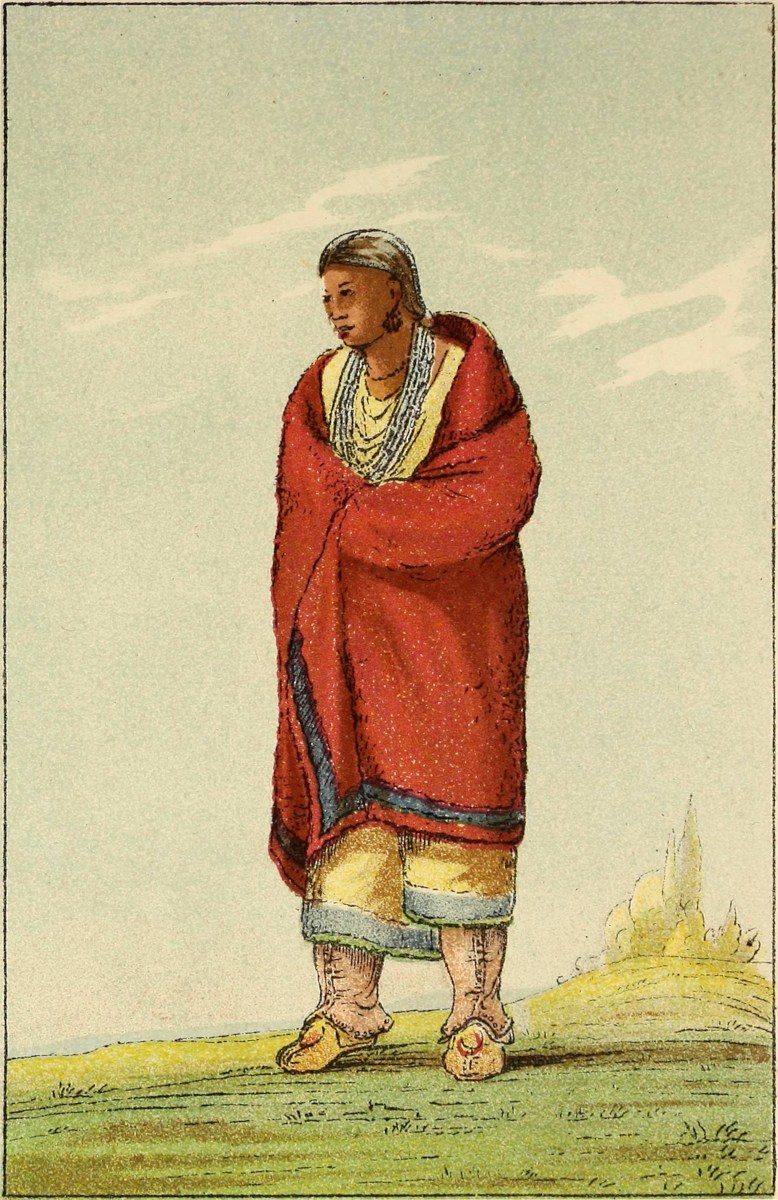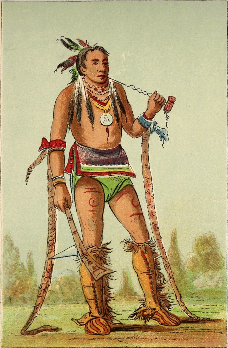 The son of White Cloud, who is now chief, and whose portrait I have just named, was tastefully dressed with a buffalo robe, wrapped around him, with a necklace of grizzly bear’s claws on his neck; with shield, bow, and quiver on, and a profusion of wampum strings on his neck.