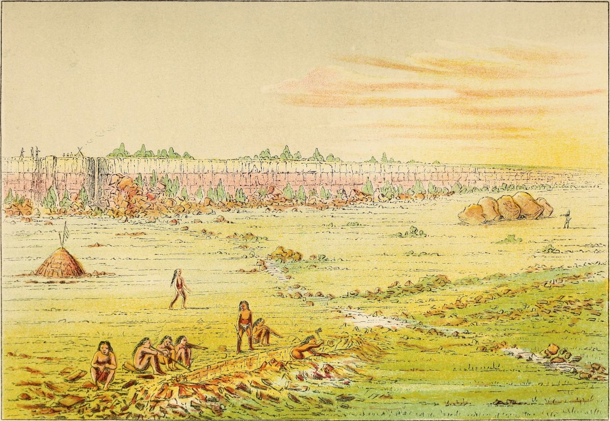 Letter c (same plate), shews the character of Mandan remains, that are met with in numerous places on the river. Their mode of resting their dead upon scaffolds is not so peculiar to them as positively to distinguish them from Sioux, who sometimes bury in the same way; but the excavations for their earth-covered wigwams, which I have said are two feet deep in the ground, with the ends of the decayed timbers remaining in them, are peculiar and conclusive evidence of their being of Mandan construction; 11and the custom of leaving the skulls bleached upon the ground in circles (as I have formerly described in plate 48, Vol. I.), instead of burying them as the other tribes do, forms also a strong evidence of the fact that they are Mandan remains.