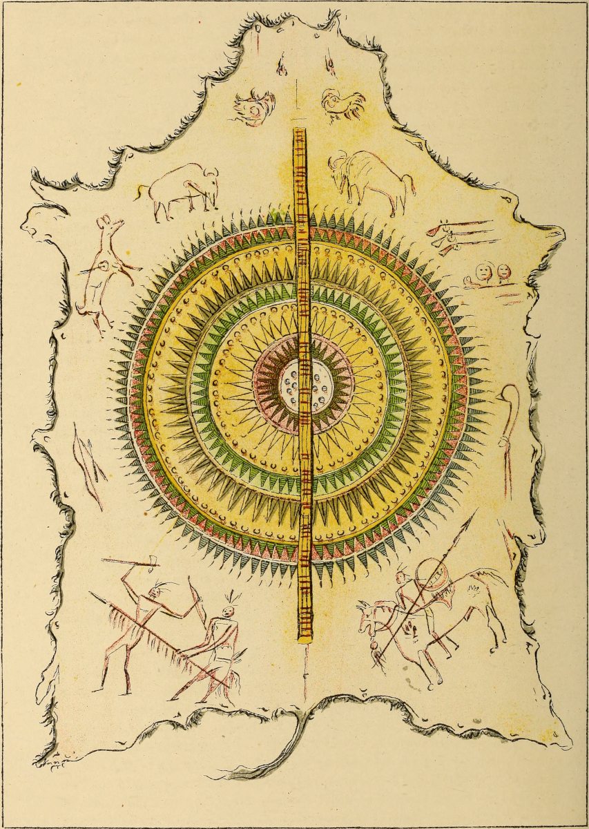 The Mandans have a peculiar way of building their wigwams, by digging down a couple of feet in the earth, and there fixing the ends of the poles which form the walls of their houses. There are other marks, such as their caches—and also their mode of depositing their dead on scaffolds—and of preserving the skulls in circles on the prairies; which peculiar customs I have before described, and most of which are distinctly to be recognized in each of these places, as well as in several similar remains which I have met with on the banks of the river, between here and the Mandans; which fully convince me, that they have formerly occupied the lower parts of the Missouri, and have gradually made their way quite through the heart of the great Sioux country; and having been well fortified in all their locations, as in10 their present one, by a regular stockade and ditch; they have been able successfully to resist the continual assaults of the Sioux, that numerous tribe, who have been, and still are, endeavouring to effect their entire destruction. I have examined, at least fifteen or twenty of their ancient locations on the banks of this river, and can easily discover the regular differences in the ages of these antiquities; and around them all I have found numerous bits of their broken pottery, corresponding with that which they are now manufacturing in great abundance; and which is certainly made by no other tribe in these regions. These evidences, and others which I shall not take the time to mention in this place, go a great way in my mind towards strengthening the possibility of their having moved from the Ohio river, and of their being a remnant of the followers of Madoc. I have much further to trace them yet, however, and shall certainly have more to say on so interesting a subject in future.