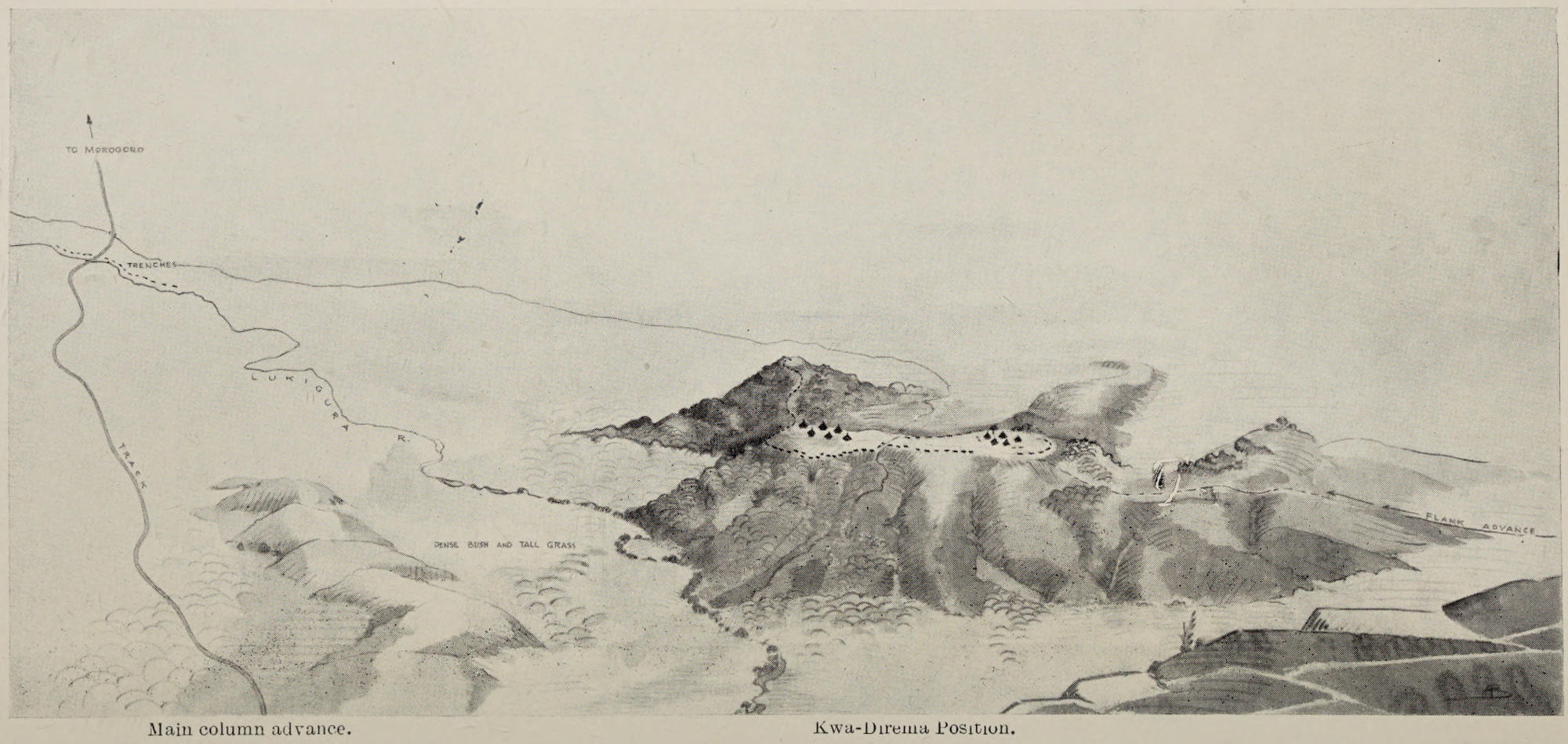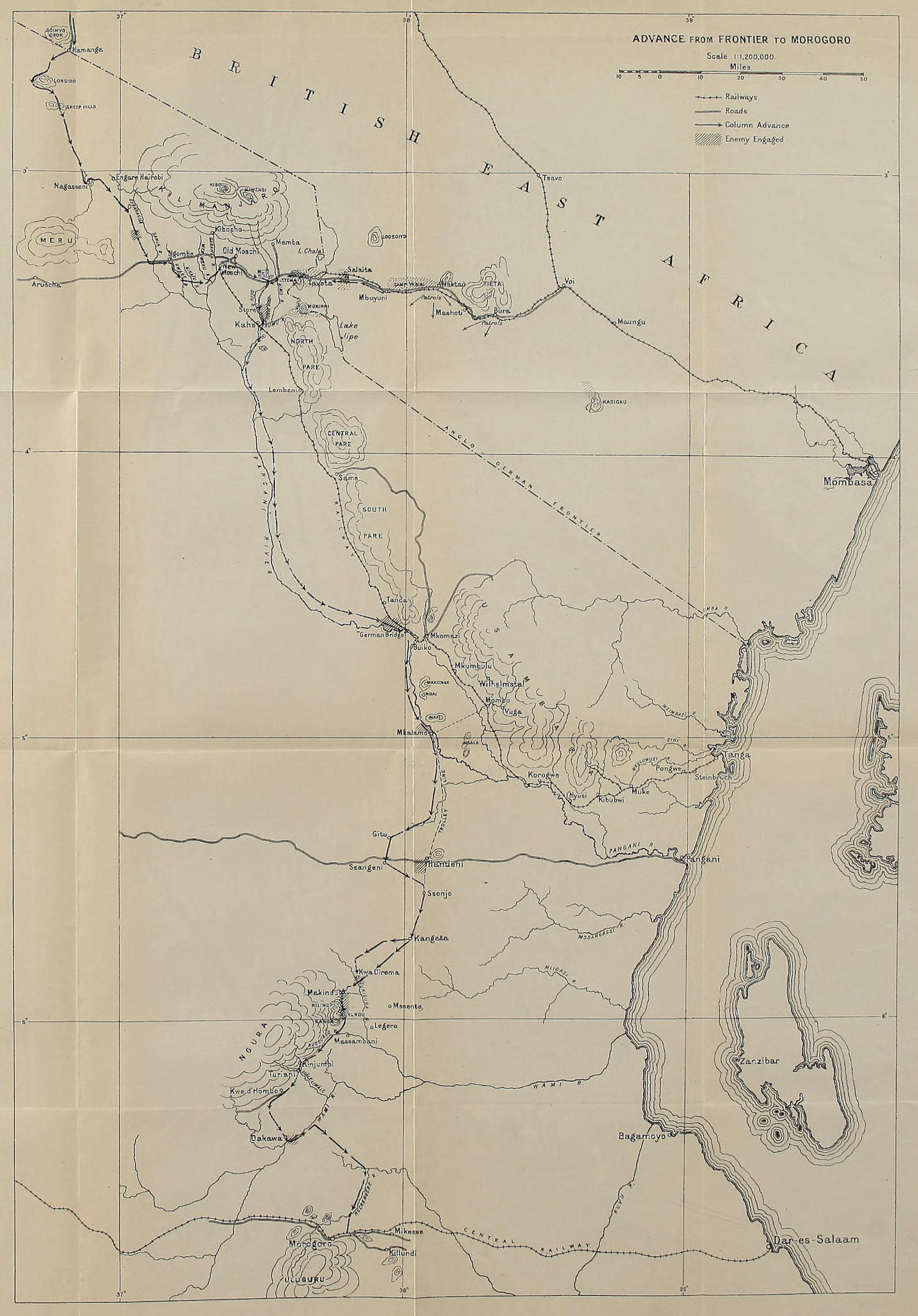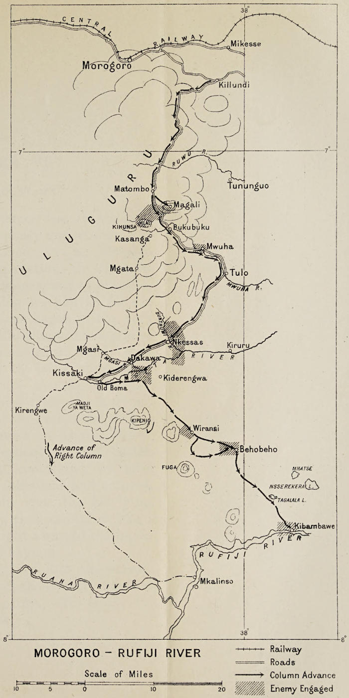 In accomplishing the conquest of German East Africa, many columns were put in the field. Those had their starting-points from the British East Africa frontier in the neighbourhood of Kilimanjaro Mountain, from Lake Victoria Nyanza, from the Belgian Congo, from Rhodesia, and latterly from the East Africa coast. To cover wide fronts of great extent of country, the forces from each of those bases advanced in their particular area in two, three, or more columns. This narrative deals directly with the operations of a single column, but, as operations throughout the columns were similar, it may be found, in part, to be generally descriptive of much that was experienced by all columns.