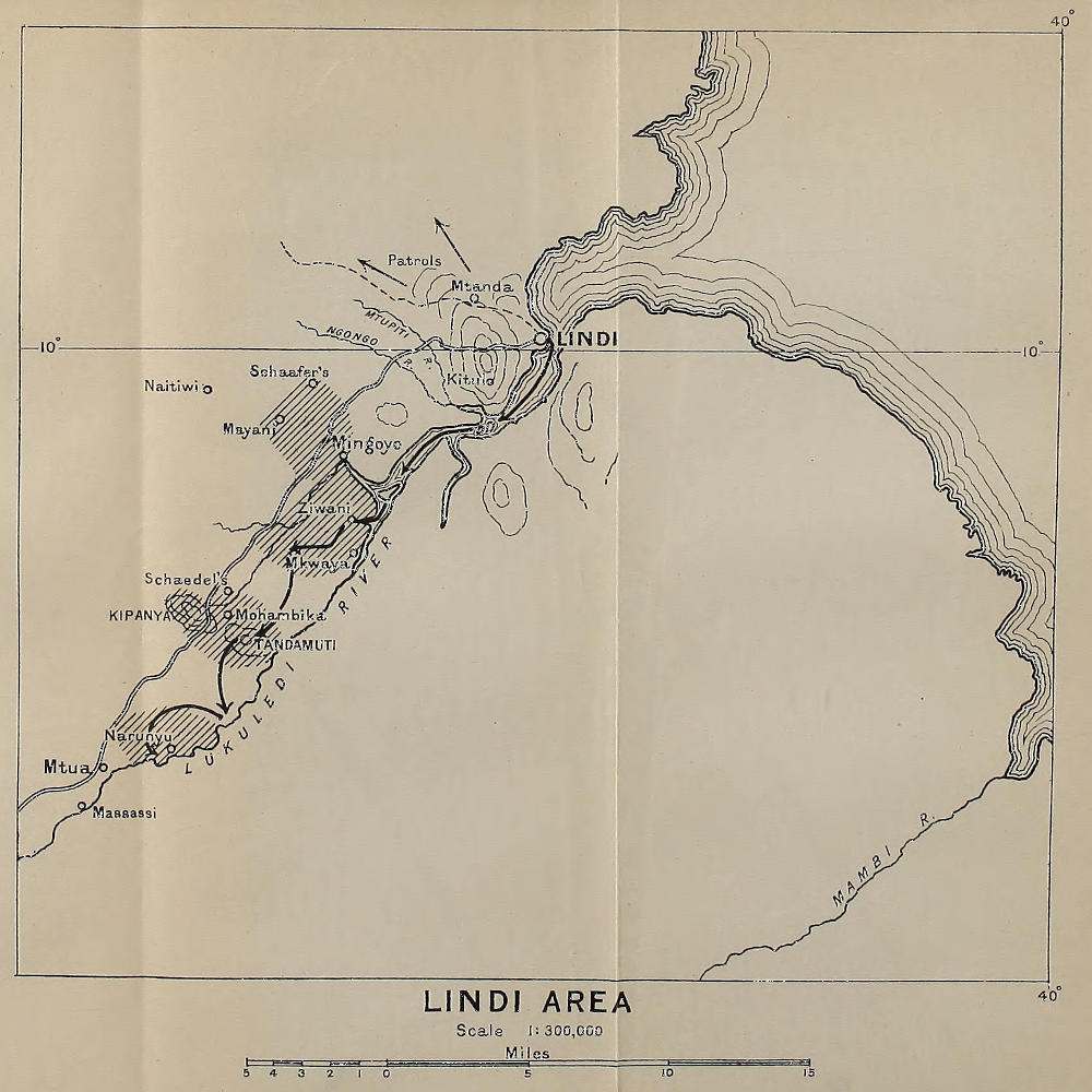 On actual operations in German East Africa—not including the operations on the frontier during 1915, nor the countless distances covered on patrol—our unit marched some 850 miles with the column, in the following stages: Kilimanjaro area, 194 miles; to the Central Railway, 335 miles; Morogoro-Rufiji area, 260 miles; and Lindi area (to date of my departure), 61 miles. Those distances are not[xix] direct to their objective as the crow flies, for they had often a zigzag course, and sometimes even doubled back to a fresh starting-point.