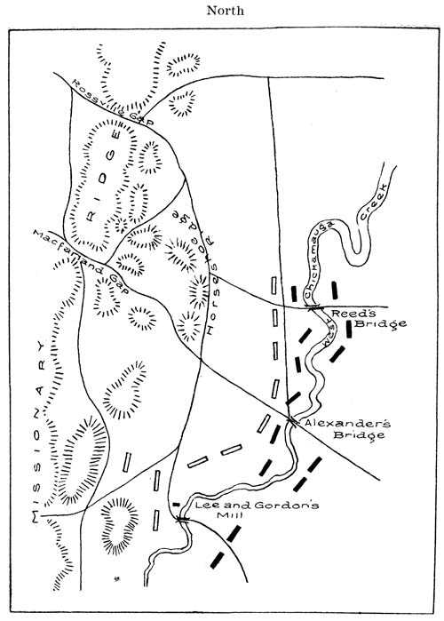 [13] Lee and Gordon’s Mill is twelve miles south of Chattanooga, on the Chickamauga River, where the Lafayette and Chattanooga wagon road crosses that stream. Ringgold is fifteen miles southeast of Chattanooga, on the east of Chickamauga, and is a railway station.