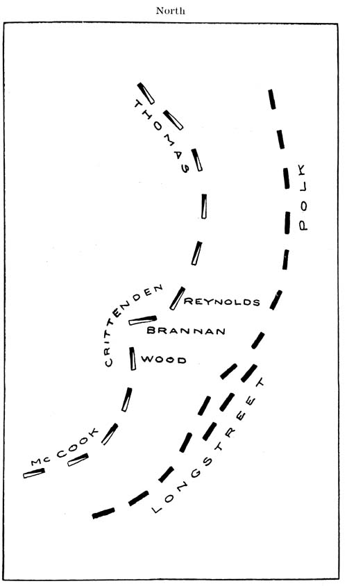 Next to Rosecrans, the most important figure among the subordinate commanders was Thomas. He was then forty-seven years old, and a graduate[15] of West Point in 1840. Between that time and the Civil War, he served in the war with Mexico, and against the Indians in the West. At the beginning of the War between the States he was major of the Second Cavalry, of which Albert Sidney Johnston was colonel, Robert E. Lee lieutenant-colonel, and William J. Hardee senior major. Thomas was the only field officer of that regiment who remained loyal to the Union. He was commissioned colonel of the regiment, reorganized it, and during the first battle of Bull Run served in General Patterson’s detachment, in the Shenandoah Valley. He was commissioned brigadier-general in August, 1861, and was sent to Kentucky to serve in the then Army of the Ohio (afterwards the Army of the Cumberland), under General Robert Anderson of Fort Sumter fame. Thomas organized the first real little army of that department at camp Dick Robinson, Kentucky, between Danville and Lexington; and in January, 1862, with this force defeated the Confederate troops under Zollicoffer, at Mill Springs, Kentucky, on the Cumberland River. This force and this place were then the extreme[16] right of the Confederate line of defense, of which Forts Donelson and Henry, in Tennessee, and Paducah, Kentucky, constituted the left. This line was fortified, and extended through Bowling Green. A month after General Thomas had turned its right at Mill Springs, General Grant also turned its left, by capturing both Forts Donelson and Henry. This necessitated the establishment of a new Confederate line farther south, the evacuation of Kentucky, and the eventual loss to the Confederates of Middle Tennessee. Just before the battle of Perryville, Kentucky, the President offered General Thomas, on September 29, 1862, the command of the Army of the Cumberland at Louisville, but he declined it. Buell was in command of the army during the battle of Perryville; after which he was superseded by Rosecrans. Thomas was a soldier, pure and simple, having never resigned from the army after his graduation from the Military Academy. He had shown great ability in the recent battle of Stone’s River, as well as in every position in which he was placed, prior to that battle. It will be seen, further on, what important movements[17] he directed in the battle of Chickamauga, which saved the Army of the Cumberland from imminent disaster.