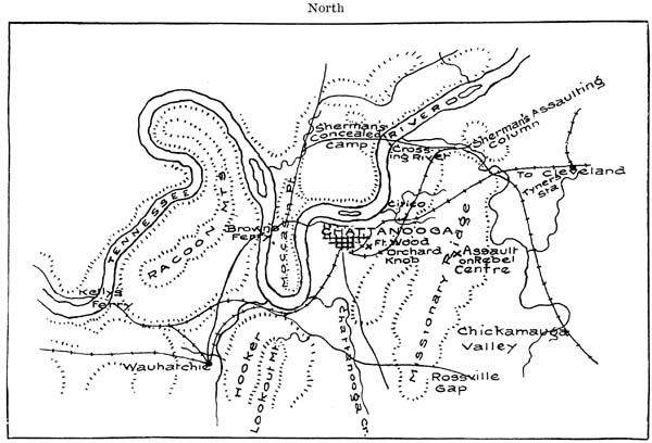 Chattanooga is the commercial gateway through which run both the Tennessee River and[9] the railways from north, east, and south. It lies near the junction of the boundary line between Alabama and Georgia, with the south line of Tennessee, at the eastern edge of the Cumberland Mountains, where the Tennessee River, flowing westward, cuts through the range. It is in a direct southeast line from Nashville. The occupation of Chattanooga by the Union Army cut the Confederacy asunder. Hence, the struggle for this position became a fierce one. It cost both sides strenuous campaigns, an immense number of lives, and the destruction of an incalculable amount of property. Its possession by a Union Army was an inhibition of any serious Confederate invasion into Middle Tennessee or Kentucky. The object of the Chattanooga campaign was, therefore, the capture of that city; and ultimately, the destruction of the Confederate Army. Should the capture of the city be accomplished, but the army of the Confederate escape, Chattanooga could be made the sub-base of a new campaign, which would effectually dismember the Confederacy, and greatly hasten its downfall. Such was the Union theory, and this actually occurred.