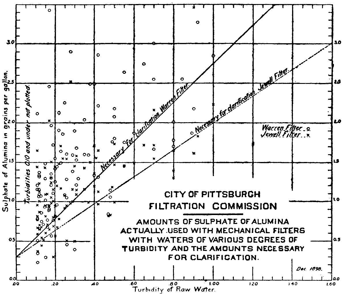 The third epoch is marked by the experiments at Louisville, Pittsburg and Cincinnati, which have greatly increased our knowledge of the treatment of waters containing enormous quantities of suspended matter, and have reduced to something like order the previously existing confused mass of data regarding coagulation and rapid filtration.