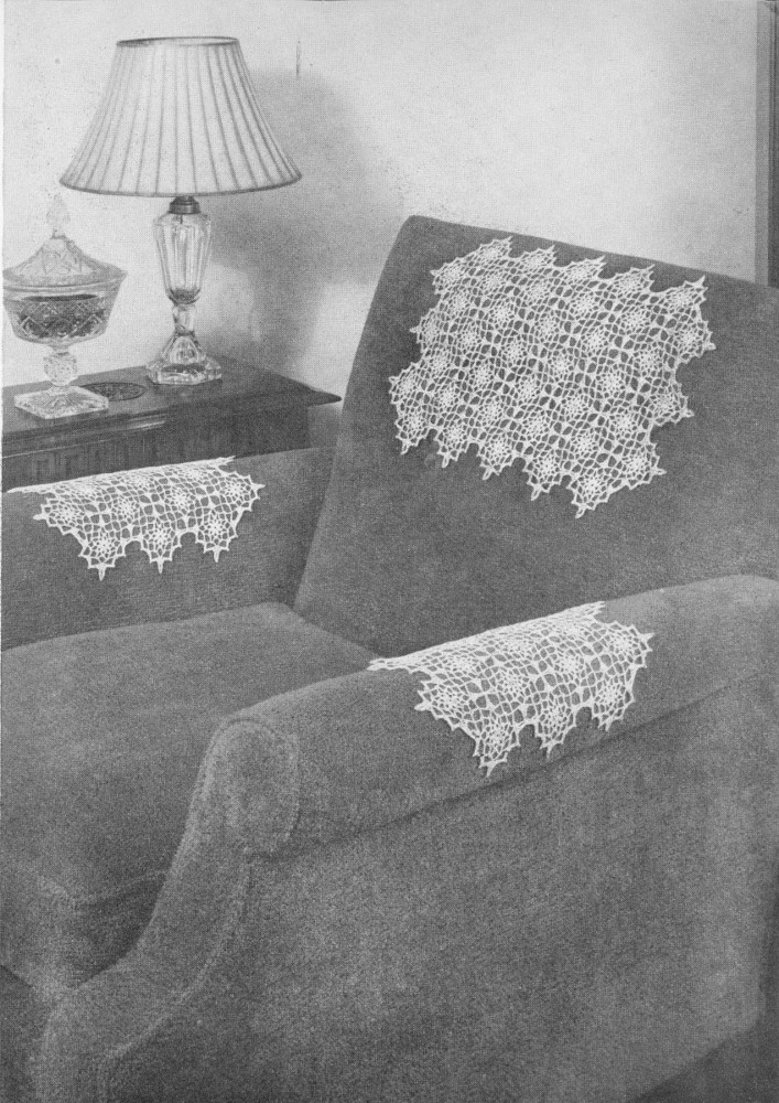ARM REST—R, 4 d, 3 p sep by 4 d, 4 d, cl r. Ch, 8 d, 3 p sep by 4 d, 8 d, turn. R, 4 d, join to last p of 1st r, 4 d, join to 2nd p of same r, 4 d, p, 4 d, cl r, turn. Ch, 8 d, 3 p sep by 4 d, 8 d, turn. R, 4 d, join to last p of last r made, 4 d, join to center p of 1st r, 4 d, p, 4 d, cl r, turn. Ch, 8 d, p, 8 d. * R, 4 d, 3 p sep by 4 d, 4 d, cl r, turn. Ch, 8 d, 3 p sep by 4 d, 8 d, join to center p of last r made, 8 d, 3 p sep by 4 d, 8 d, turn. R, 4 d, p, 4 d, join to center p of last r made, 4 d, p, 4 d, cl r, turn. Ch, 8 d, p, 8 d. Repeat from * 12 times, turn. R, 4 d, 3 p sep by 4 d, 4 d, cl r, turn. Ch, 8 d, 3 p sep by 4 d, 8 d, turn. R, 4 d, join to last p of last r, 4 d, join to center p of same r, 4 d, p, 4 d, cl r, turn. Ch, 8 d, 3 p sep by 4 d, 8 d, turn. R, 4 d, join to last p of last r, 4 d, join to center p of opposite r, 4 d, p, 4 d, cl r, turn. * Ch, 8 d, p, 8 d. R, 4 d, 3 p sep by 4 d, 4 d, cl r, turn. Ch, 8 d, p, 4 d, join to center p of opposite ch, 4 d, p, 8 d, join to center p of last r made, 8 d, p, 4 d, join to center p of opposite ch, 4 d, p, 8 d, turn. R, 4 d, p, 4 d, join to center p of last r made, 4 d, p, 4 d, cl r, turn. Repeat from * 12 times. Ch, 8 d, p, 8 d, tie and cut.