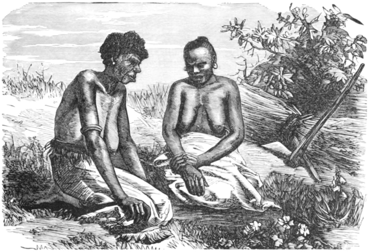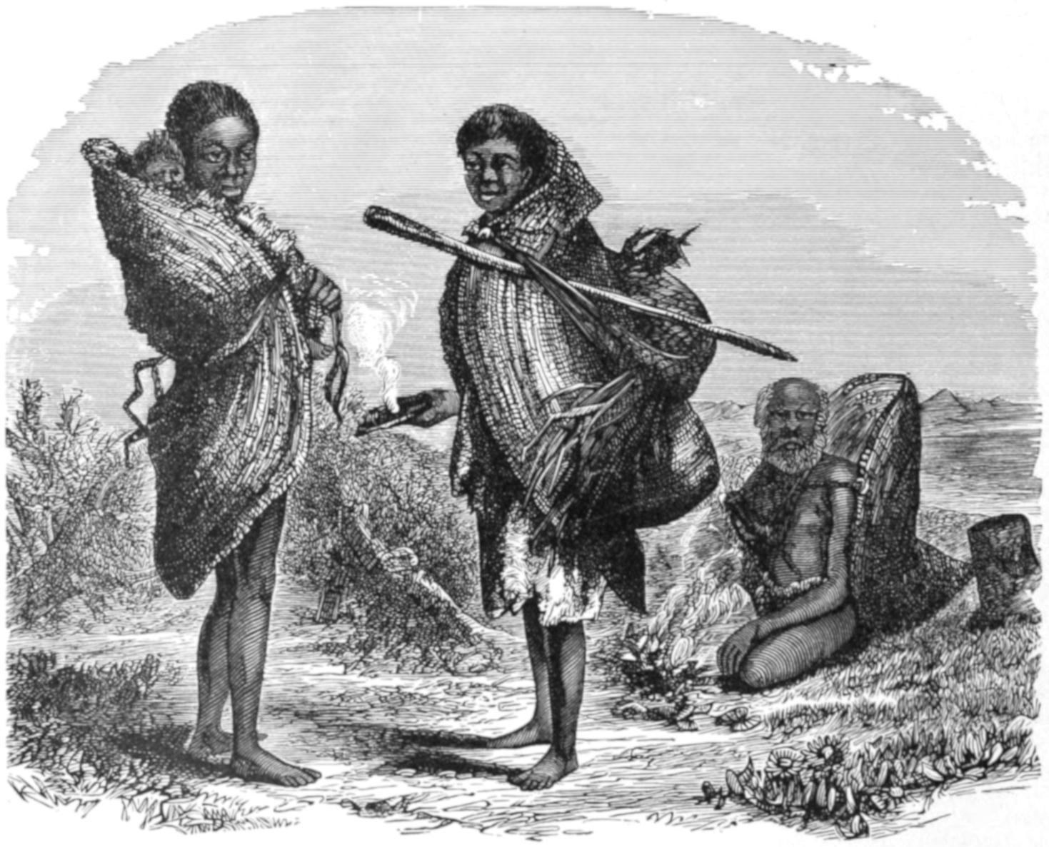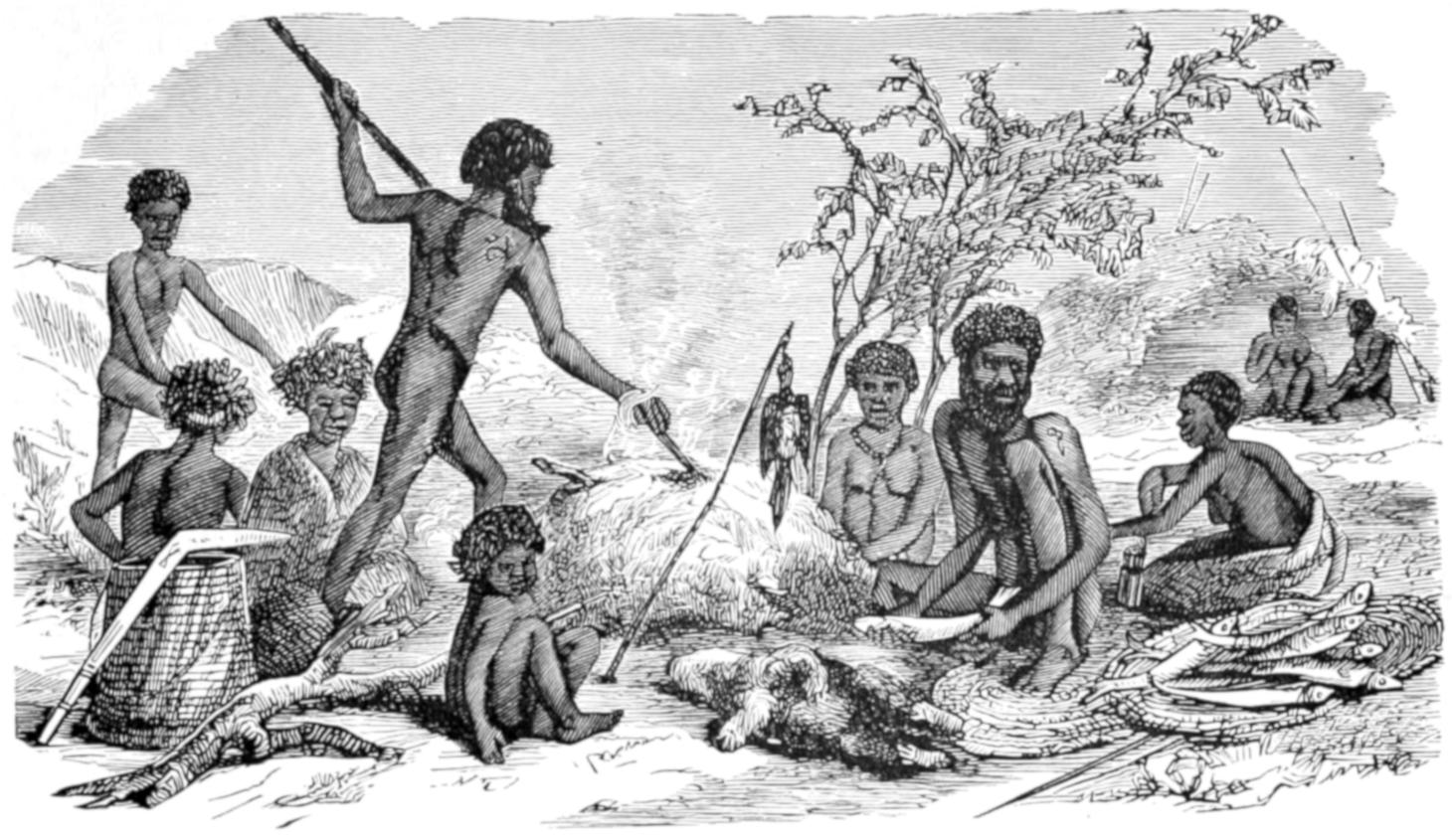 Many of the particulars which have been and will be related of the domestic life of the Australians were obtained in a very curious manner. In the autumn of 1849 some persons belonging to H.M.S. Rattlesnake were out shooting, when they came across a native woman, or gin, dressed rather better than the generality of native women, as she wore a narrow apron of leaves. To their astonishment, the supposed gin addressed them in English, saying that she was a white woman, and desired their help. They immediately furnished her with some clothing, and brought her on board the Rattlesnake, where she contrived to make known her sad story. Her name was Thomson, and she was the widow of the owner of a small vessel. Cruising one day in search of a wreck, the pilot missed his way, a gale of wind came on, and the vessel was dashed on a reef on the Eastern Prince of Wales Island. The men tried to swim on shore through the surf, but were drowned, while the woman was saved by a party of natives, who came on board the wreck after the gale had subsided, and took her ashore.