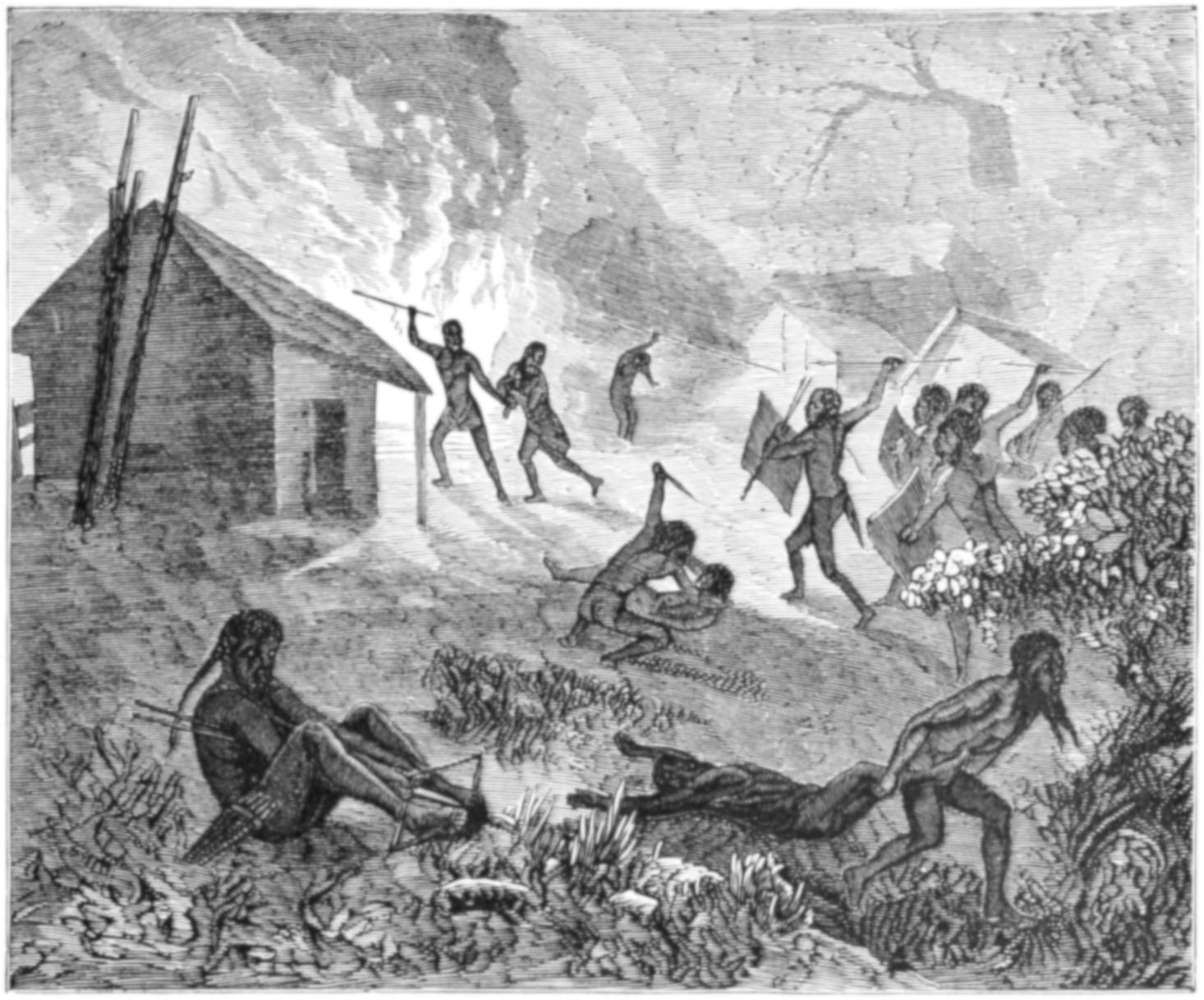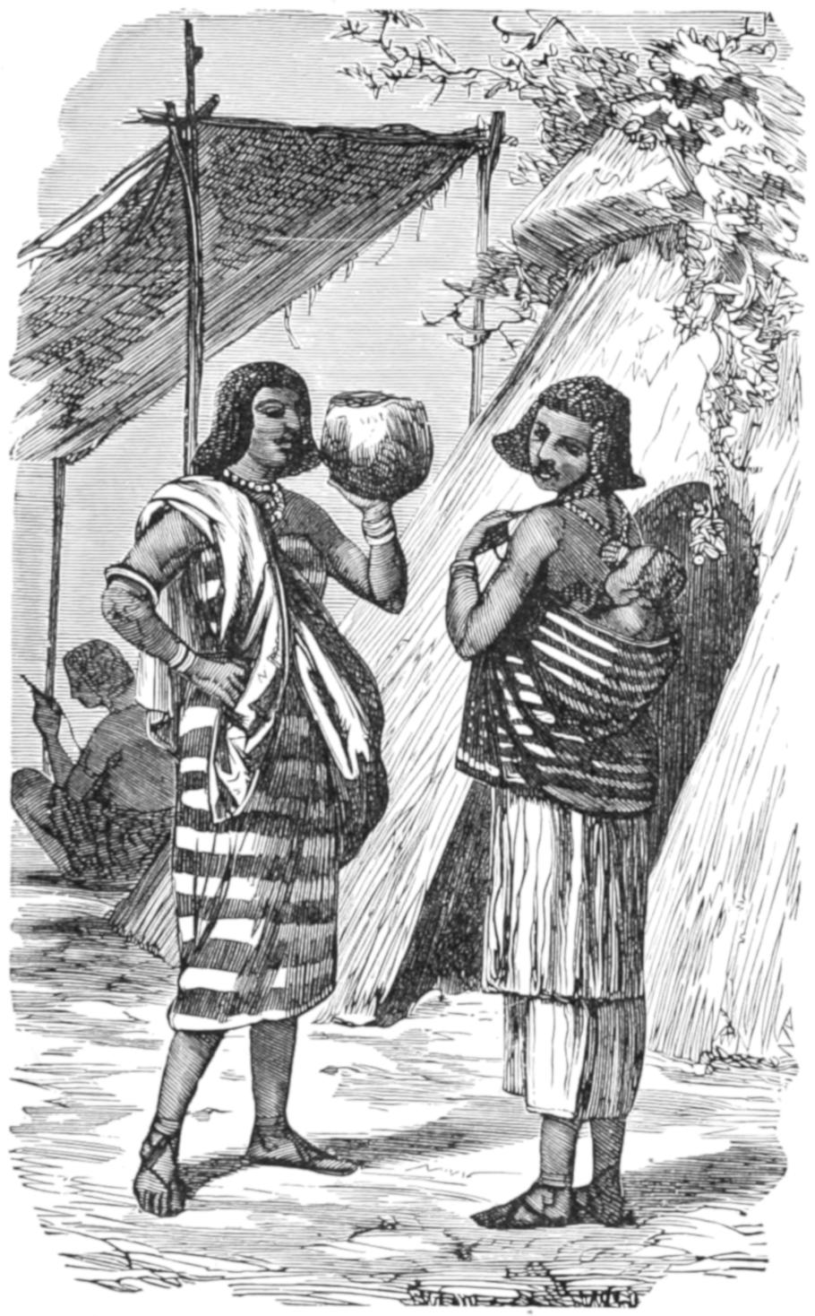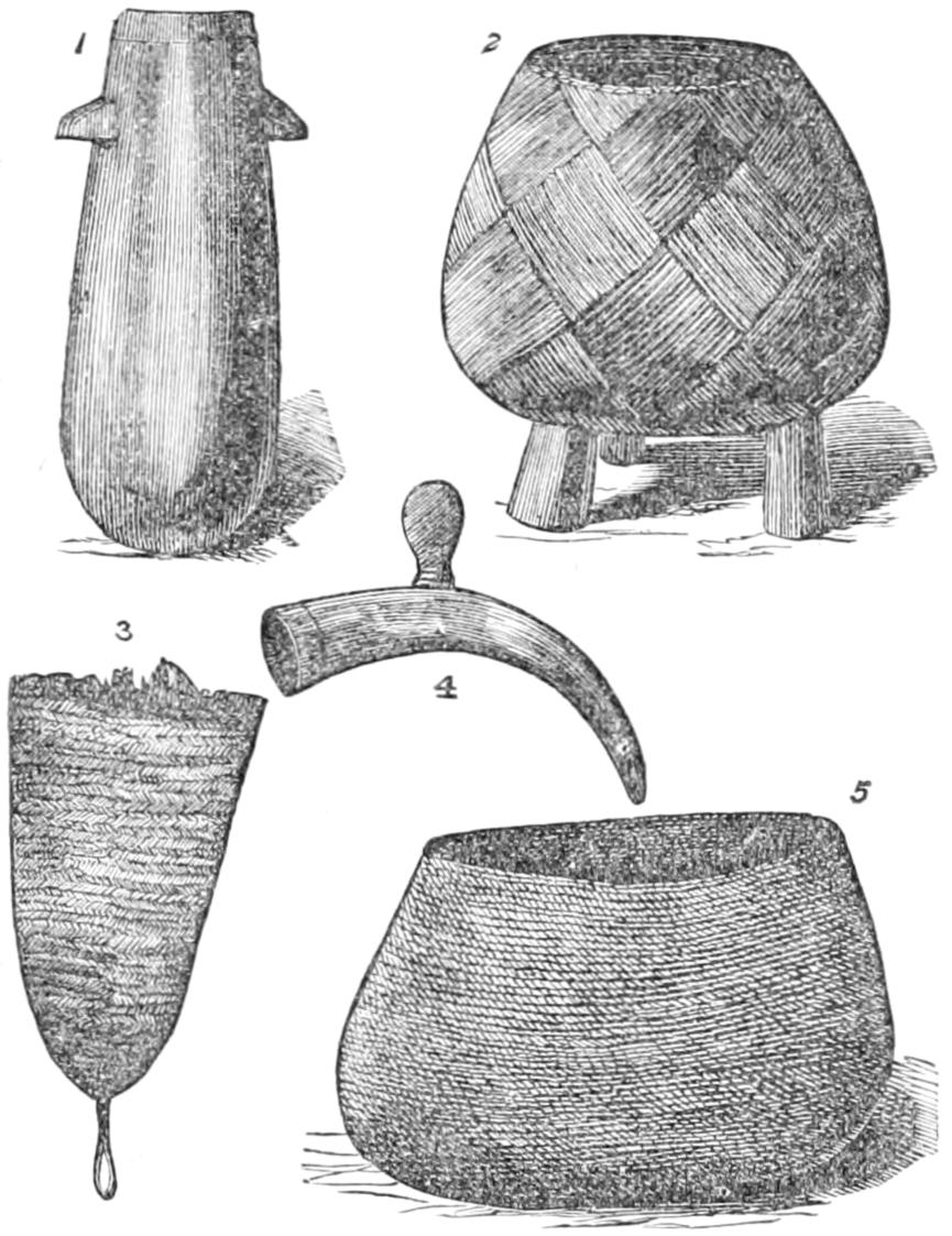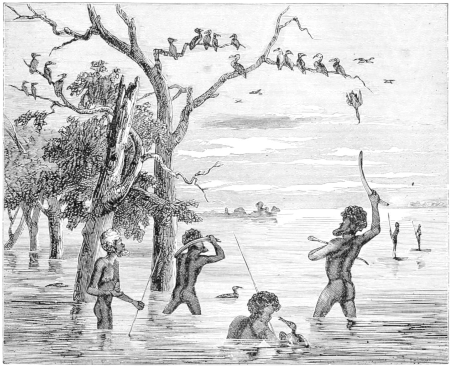Many of the particulars which have been and will be related of the domestic life of the Australians were obtained in a very curious manner. In the autumn of 1849 some persons belonging to H.M.S. Rattlesnake were out shooting, when they came across a native woman, or gin, dressed rather better than the generality of native women, as she wore a narrow apron of leaves. To their astonishment, the supposed gin addressed them in English, saying that she was a white woman, and desired their help. They immediately furnished her with some clothing, and brought her on board the Rattlesnake, where she contrived to make known her sad story. Her name was Thomson, and she was the widow of the owner of a small vessel. Cruising one day in search of a wreck, the pilot missed his way, a gale of wind came on, and the vessel was dashed on a reef on the Eastern Prince of Wales Island. The men tried to swim on shore through the surf, but were drowned, while the woman was saved by a party of natives, who came on board the wreck after the gale had subsided, and took her ashore.