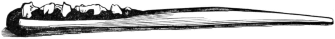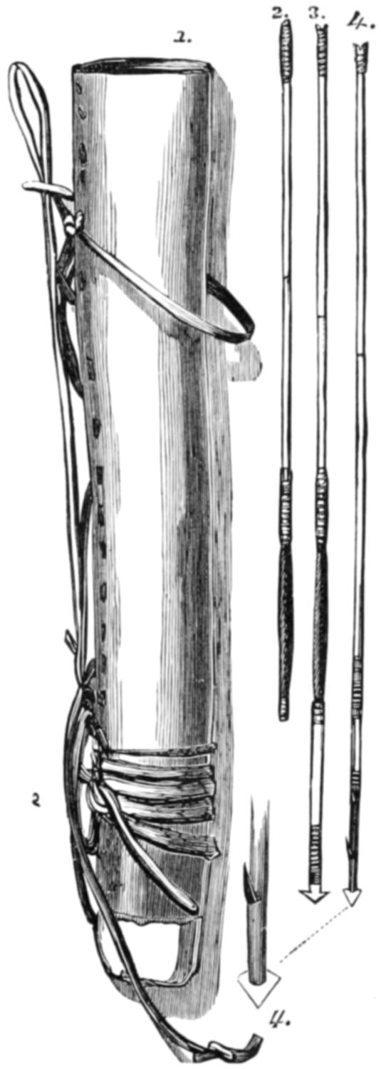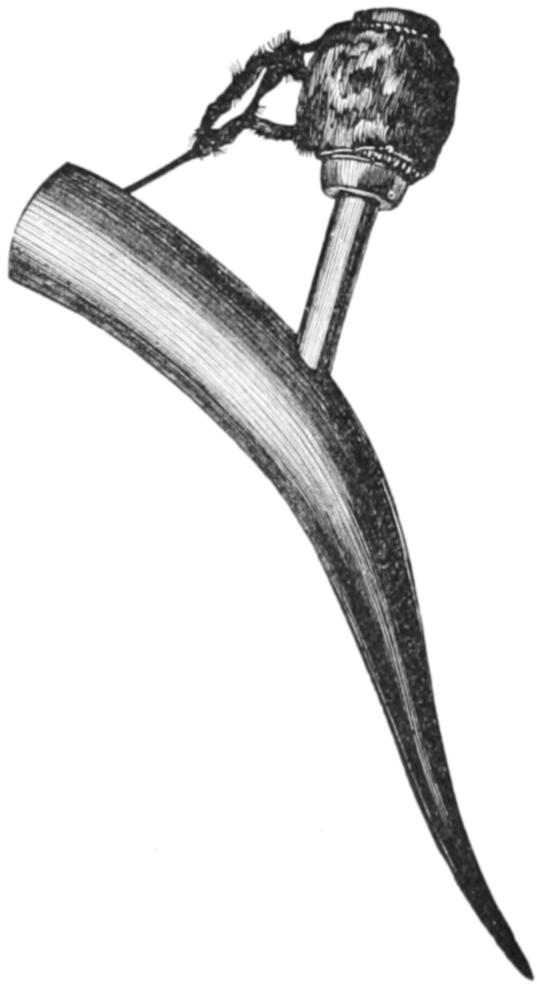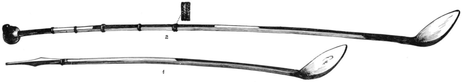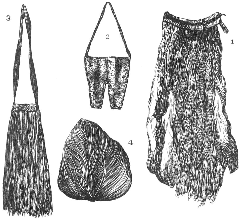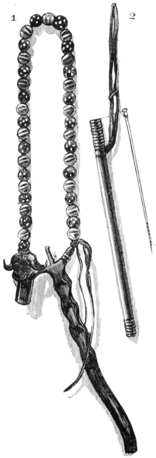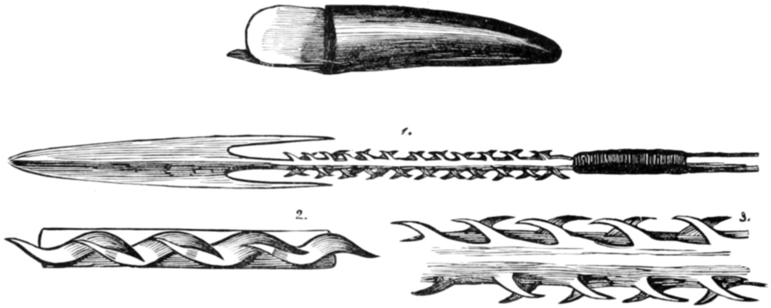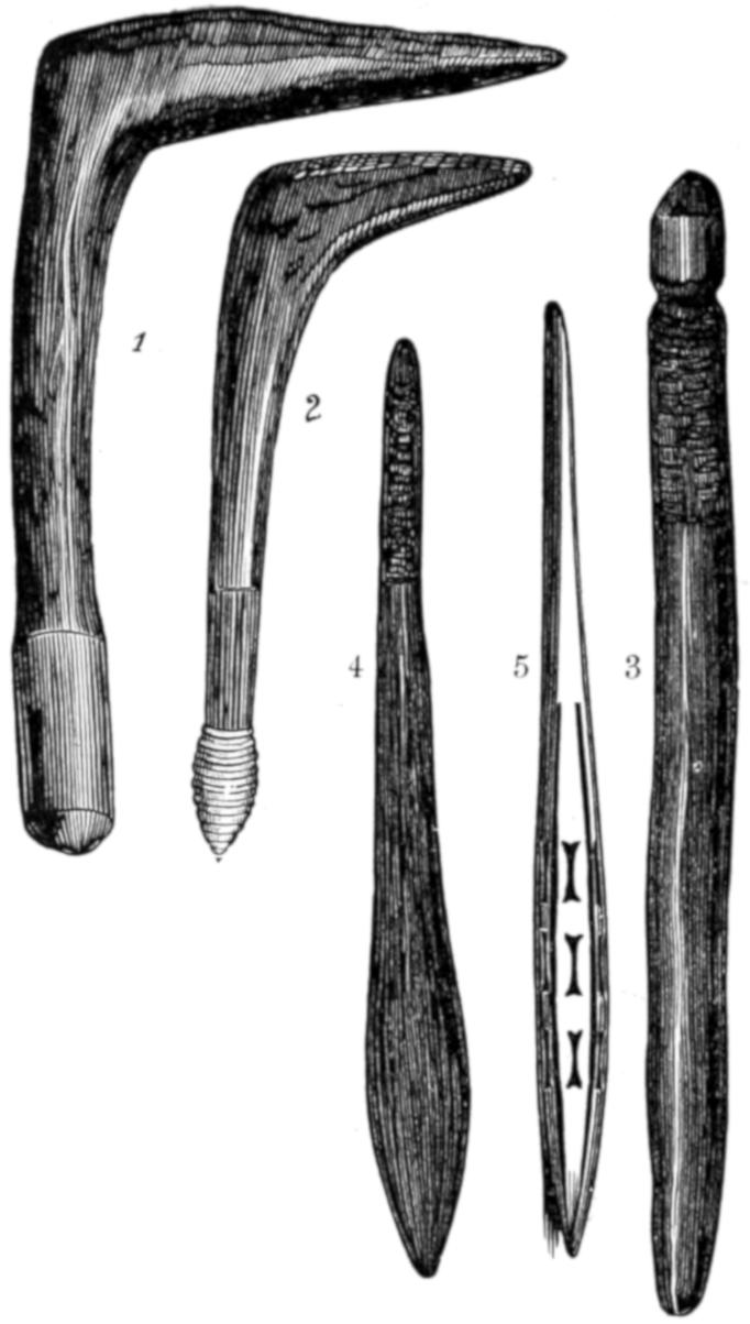 The illustration No. 1, on page 765, is given in order to show the curious appearance which is sometimes presented by the men when they have successfully passed through their various ordeals. The name of the man was Mintalta, and he belonged to the Nauo tribe, which lives near Coffin’s Bay. In his hand he holds the waddy, and, by way of apron, he wears a bunch of emu feathers. Across his breast are seen the bold ridges which mark his rank as a man, and others are seen upon his arms. His beard is gathered into a long pointed tuft, and decorated with a little bunch of white cockatoo feathers at the tip. In his hair he wears two curious ornaments. These are not feather plumes, as they seem to be in the illustration, but are simply slender sticks of white wood, scraped so as to let the shavings adhere by one end. Indeed, they are made exactly like those little wooden brooms that are sometimes hawked by German girls about the streets, or, to use a more familiar simile, like the curly-branched trees in children’s toy-boxes.