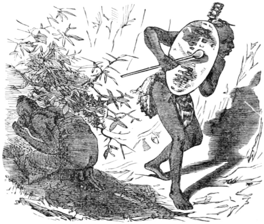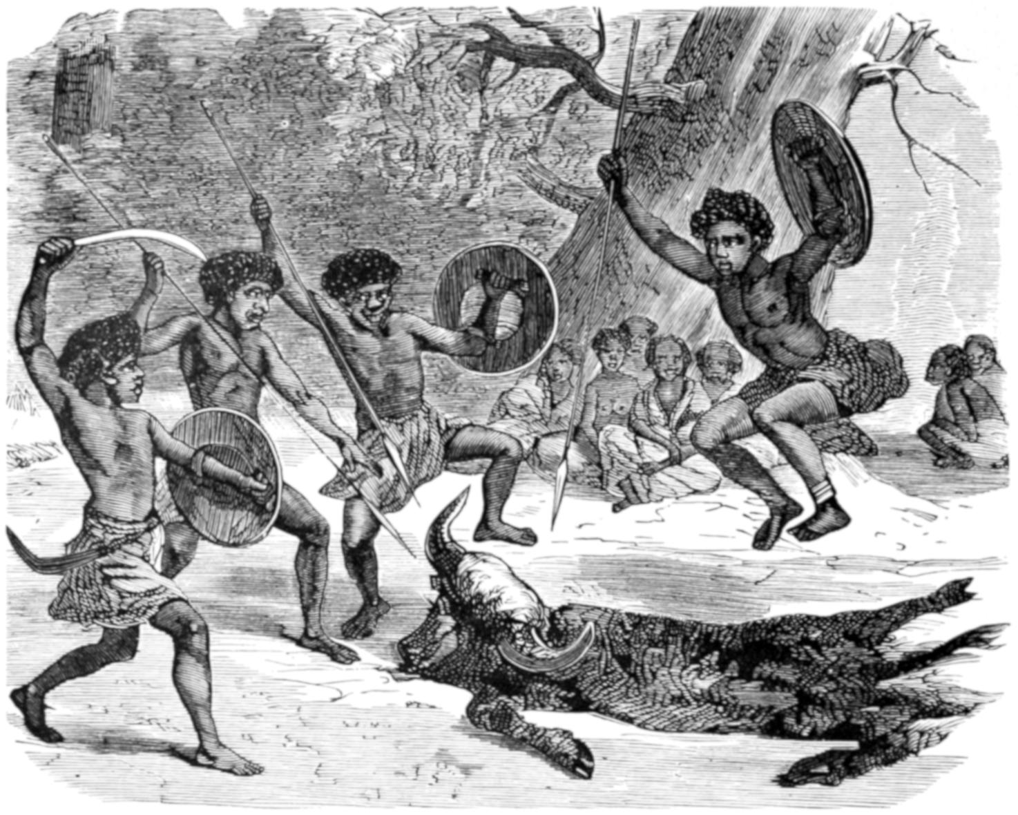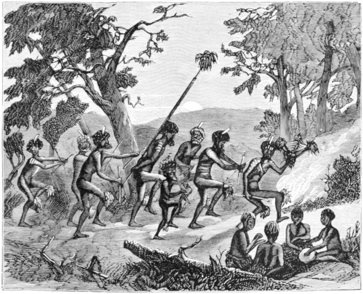 Accordingly, a stout native now appears on the scene, bearing on his shoulders the rude effigy of a kangaroo, made of grass; and after him walks another man with a load of brushwood. The men move with measured steps, in time to the strokes of clubs upon shields, wherewith the spectators accompany the songs which they sing. At the end of the dance, the men lay their burdens at the feet of the youths, the grass effigy signifying the kangaroo, and the brushwood being accepted as a sign of its haunts.