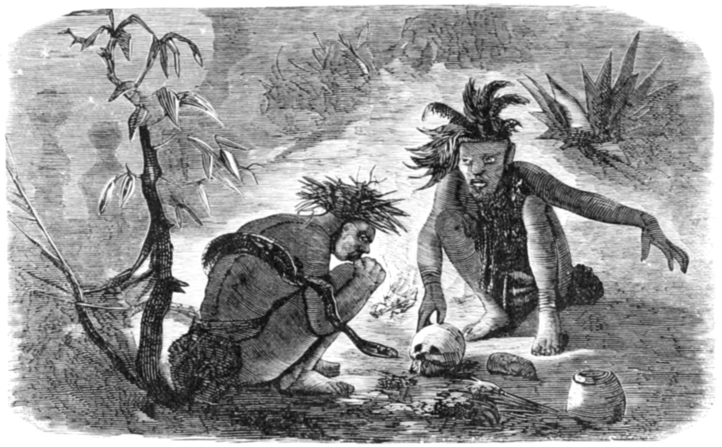 “They are taken to a retired spot, laid upon their stomachs, and entirely covered over with kangaroo skins; the men uttering the most dismal wail imaginable, at intervals of from three to five minutes. After lying thus for some time, the lads are raised, and, whilst still blindfolded, two men throw green boughs at them, while the others stand in a semicircle around, making a noise with their wirris and voices combined, which is so horrible that the wild dogs swell the hideous chorus with their howlings. Suddenly one of the party drops a bough, others follow; and a platform of boughs is made, on which the lads are laid out. The sponsors then turn to and sharpen their pieces of quartz, choosing a new name for each lad, which is retained by him during life. These names all end either in alta, ilti, or ulta. Previous to this day they have borne the names of their birth-places, &c.; which is always the case amongst the women, who never change them afterward. The sponsors now open the veins of their own arms, and, raising the lads, open their mouths, and make them swallow the first quantity of blood.