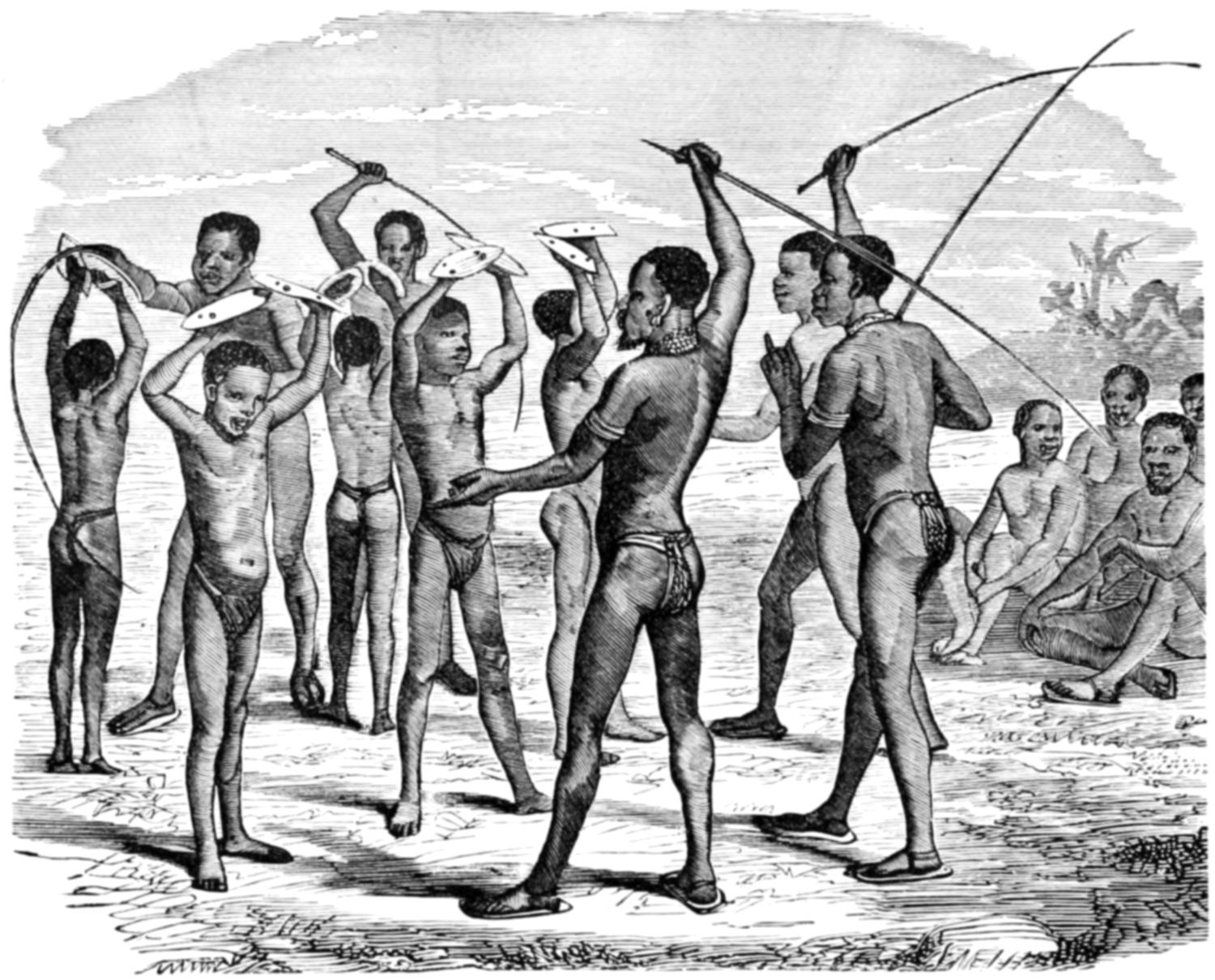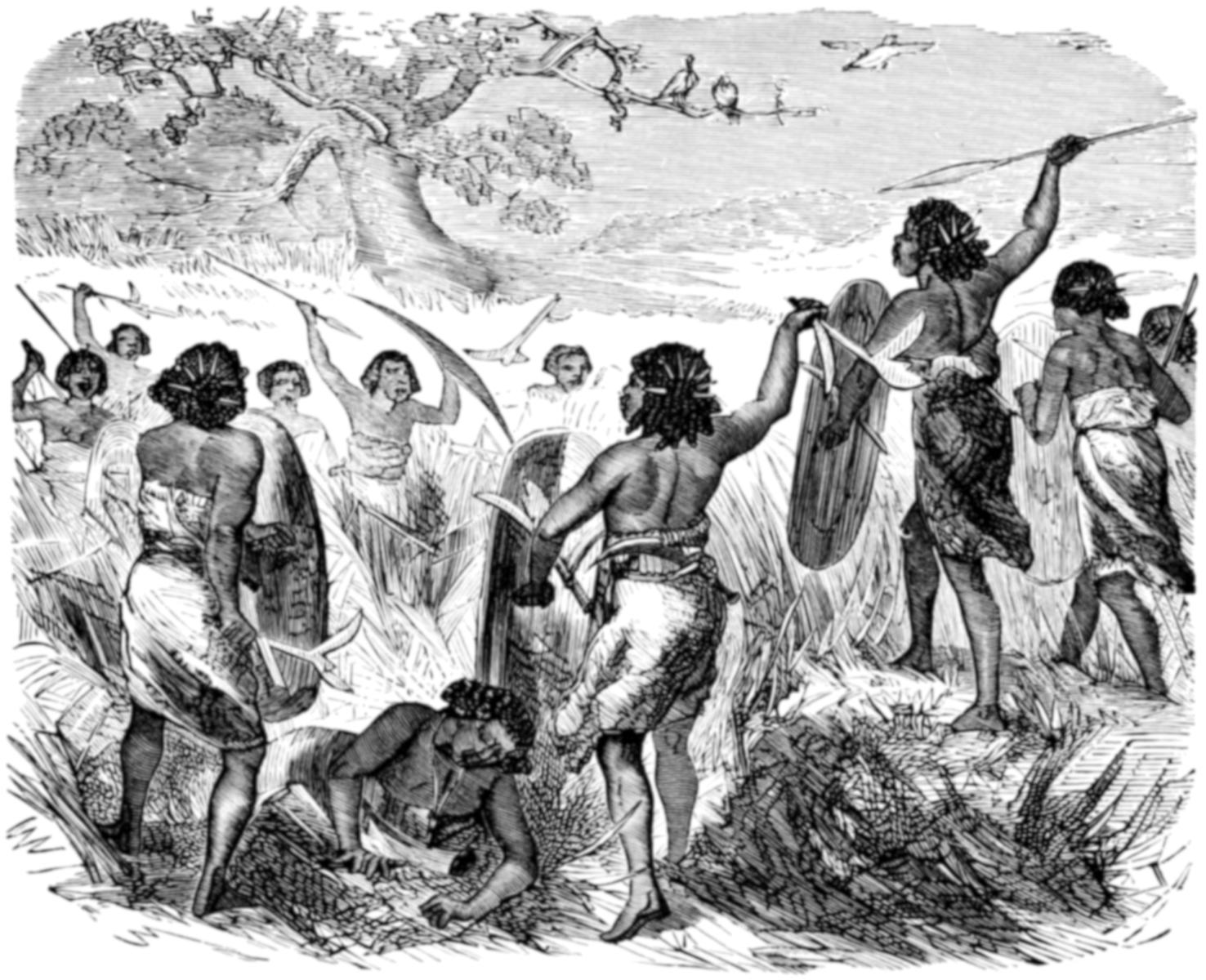 After a few more ceremonies, the men lie on the ground, and the boys are led over their prostrate bodies, the men groaning and writhing, and pretending to suffer horrible agony from the contact with uninitiates. At last the boys are drawn up in a row, and opposite to them stands the principal koradjee, holding his shield and waddy, with which he keeps up a series of regular strokes, the whole party poising their spears at him, and at every third stroke touching his shield.