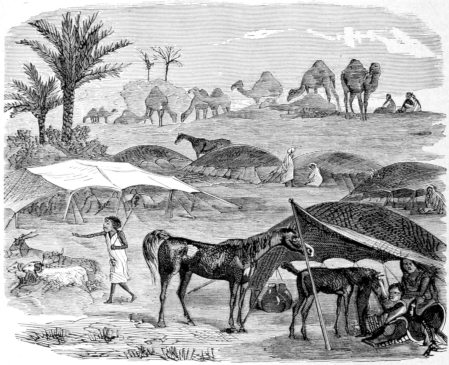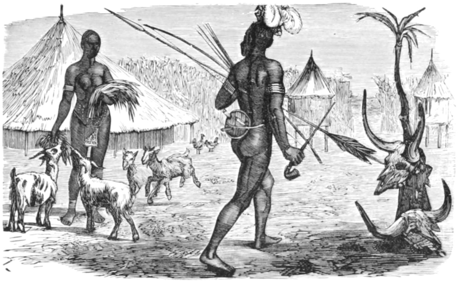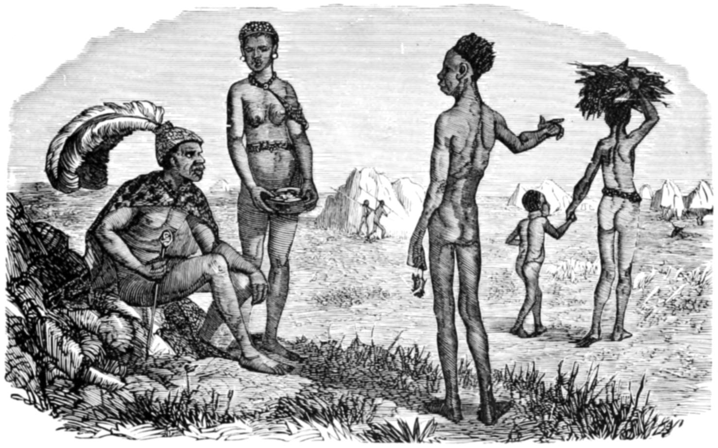 The Frontispiece gives a pictorial representation of African mankind. Superstition reigning supreme, the most prominent figure is the fetish priest, with his idols at his feet, and holding up for adoration the sacred serpent. War is illustrated by the Kaffir chief in the foreground, the Bosjesman with his bow and poisoned arrows, and the Abyssinian chief behind him. The gluttony of the Negro race is exemplified by the sensual faces of the squatting men with their jars of porridge and fruit. The grace and beauty of the young female is shown by the Nubian girl and Shooa woman behind the Kaffir; while the hideousness of the old women is exemplified by the Negro woman above with her fetish. Slavery is illustrated by the slave caravan in the middle distance, and the pyramids speak of the interest attached to Africa by hundreds of centuries.