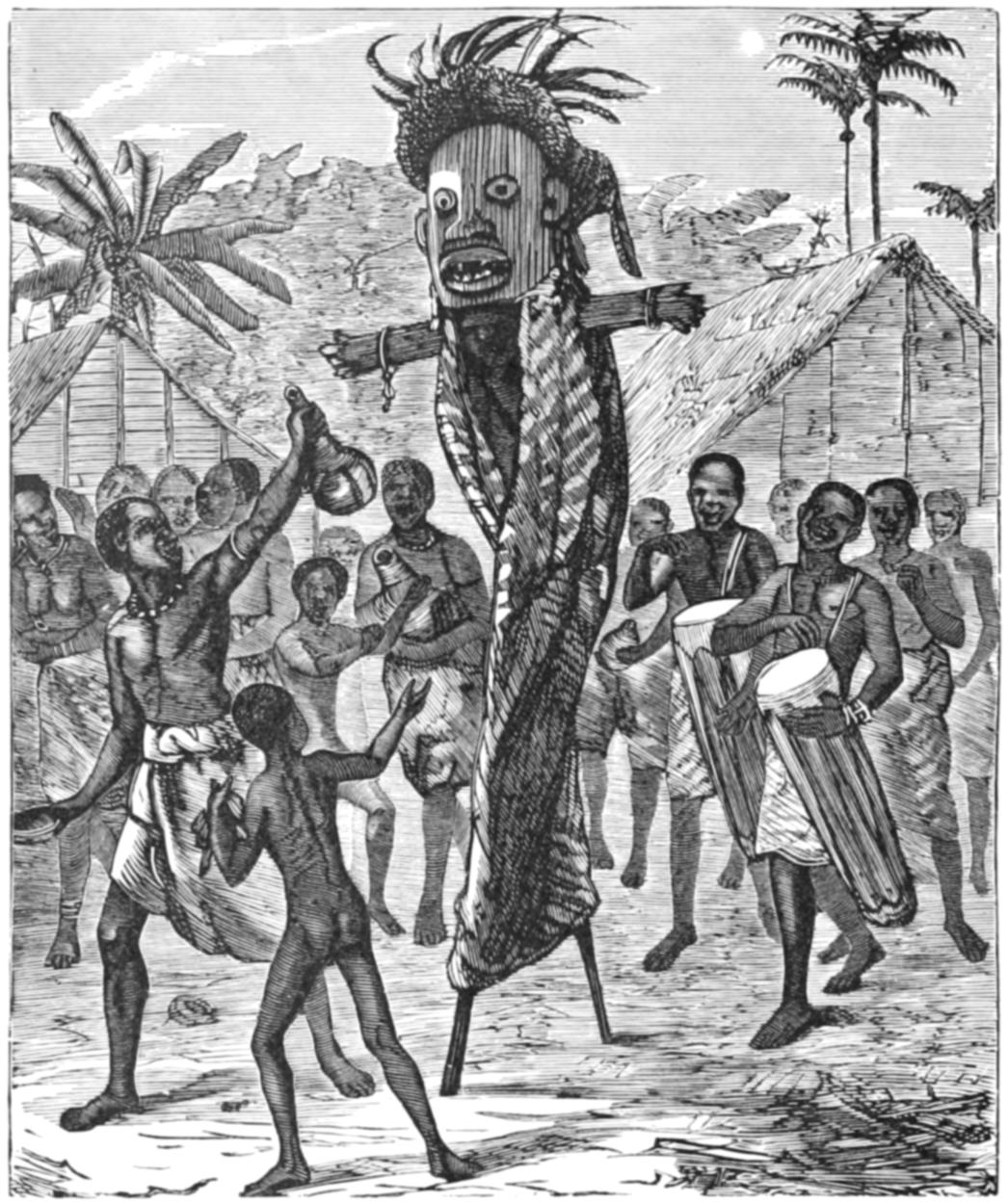 The first ceremony is a very simple one. When the boys are twelve or fifteen years old, they are carried away from the women, and are blindfolded. The operators then begin to shout the words “Herri, herri” with the full force of their lungs, swinging at the same time the mysterious instrument called the witarna.