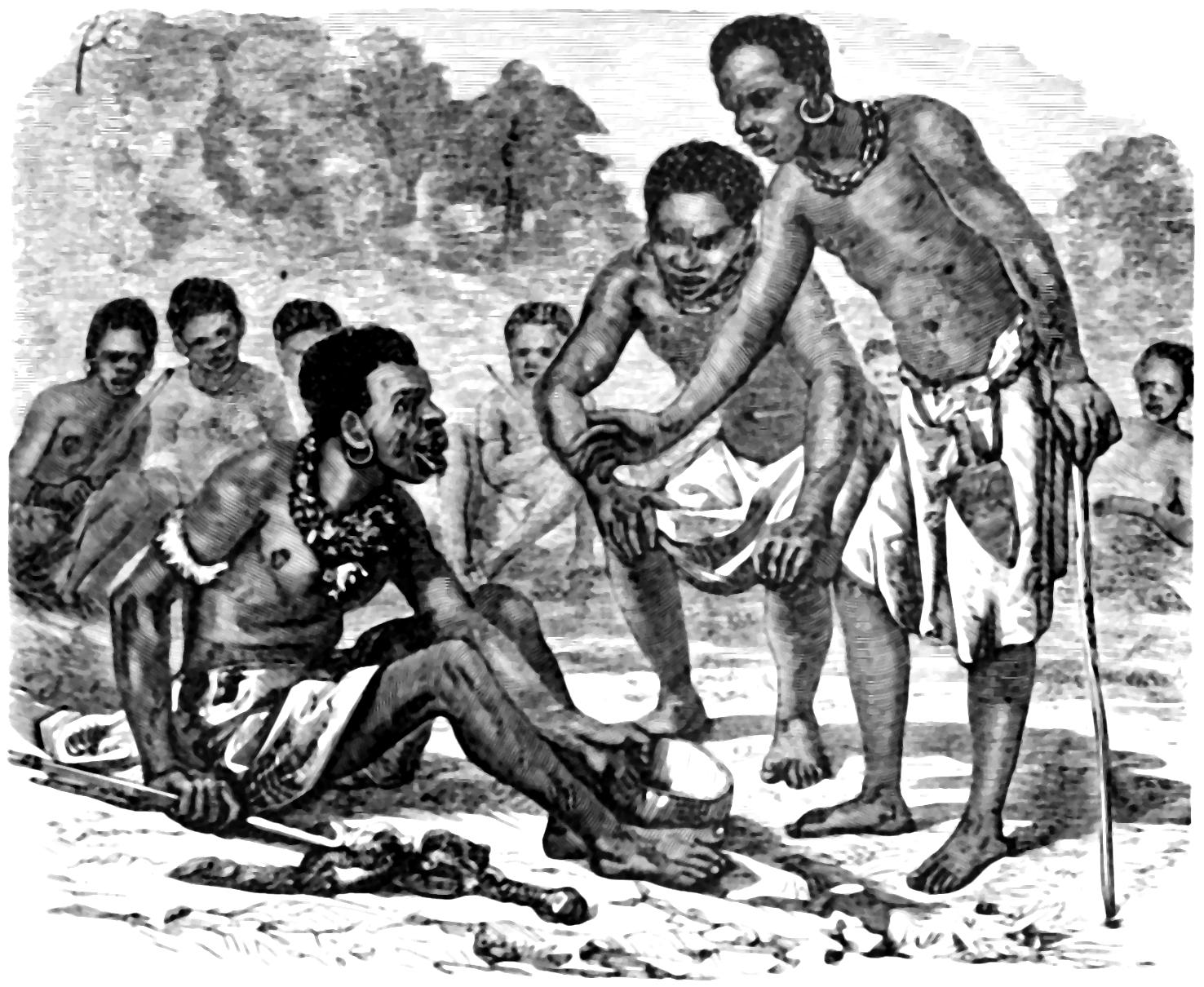 One of these customs, which seems to belong to almost every variety of savage life, namely, the loss of certain teeth, flourishes among the Australians. The mode of extracting the teeth is simple enough. The men who conduct the ceremony pretend to be very ill, swoon, and writhe on the ground, and are treated after the usual method of healing the sick, i. e. their friends make a howling and shouting, dance round and hit them on the back, until each sick man produces a piece of sharp bone.