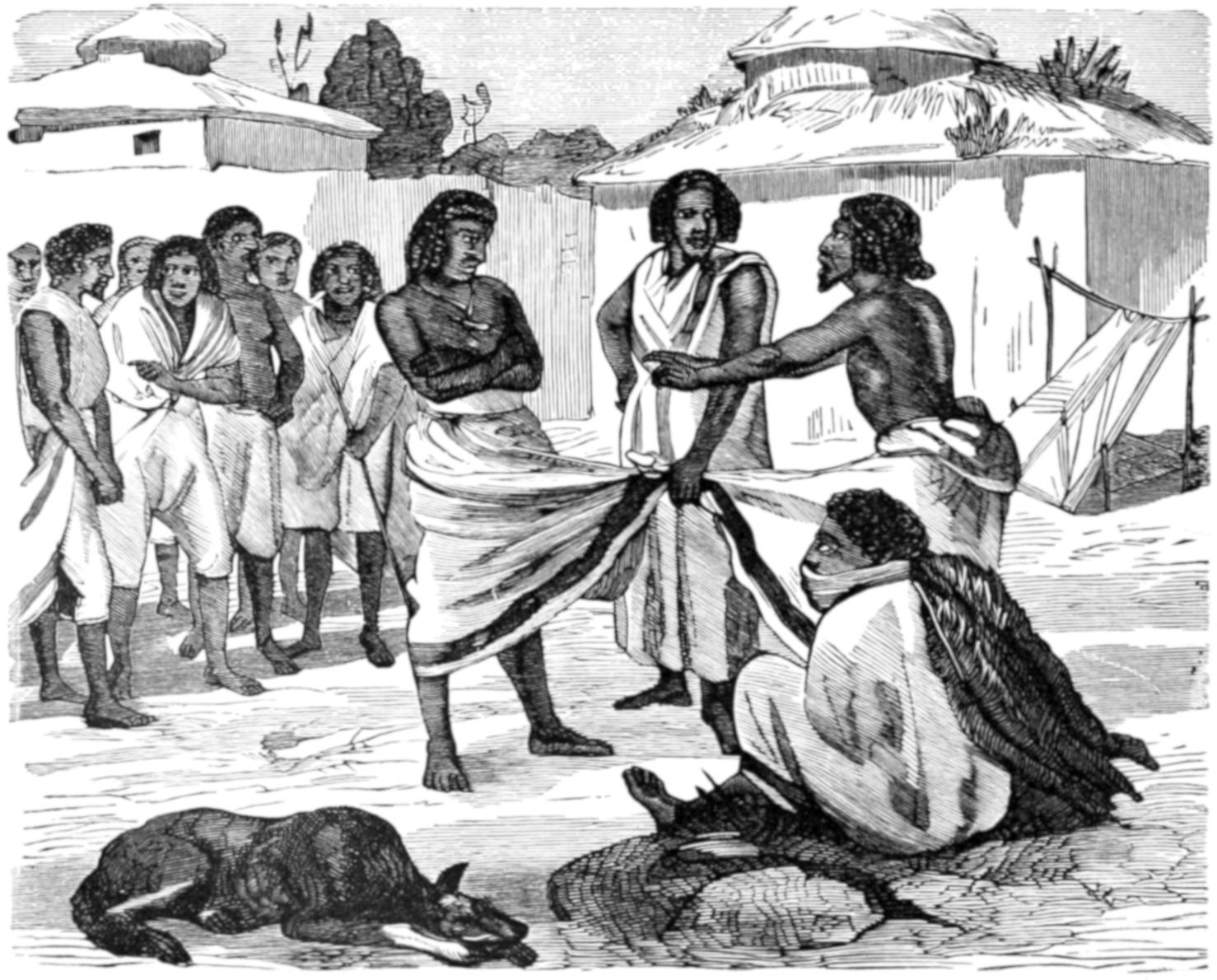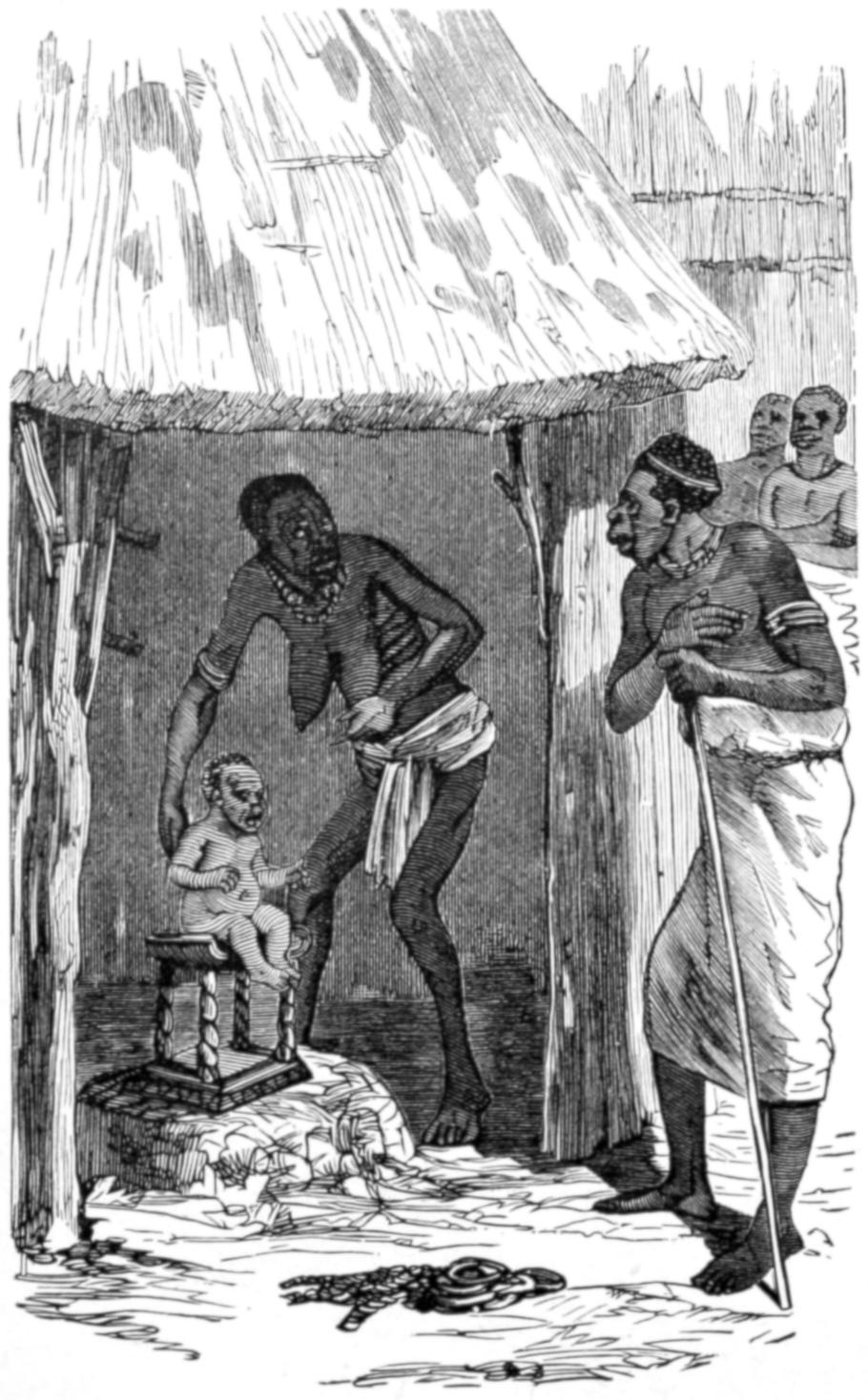 In some parts of the country there is a curious addition to the mere loss of the tooth. The warriors stand over the lad, exhorting him to patience, and threatening him with instant death if he should flinch, cry out, or show any signs of pain. The operators then deliberately cut long gashes all down his back, and others upon his shoulders. Should he groan, or display any symptoms of suffering, the operators give three long and piercing yells, as a sign that the youth is unworthy to be a warrior. The women are summoned, and the recreant is handed over to them, ever after to be ranked with the women, and share in their menial and despised tasks.