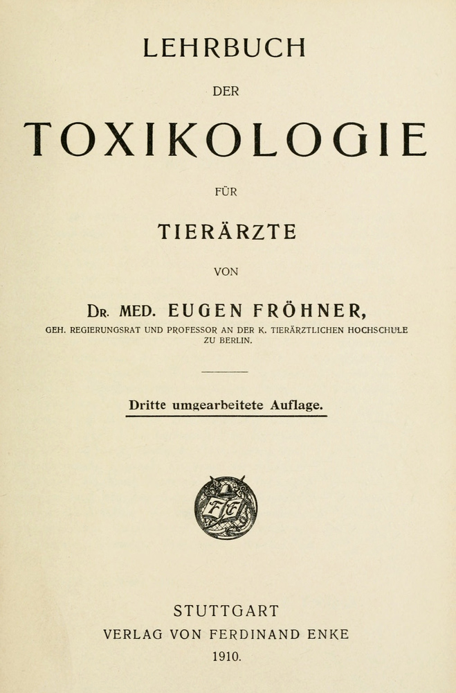 Die Herausgabe einer tierärztlichen Toxikologie ist mir von verschiedenen Seiten nahegelegt worden. Mit Rücksicht auf diese Anregungen und in Erwägung des Umstandes, dass wir in der Tierheilkunde ein selbständiges Lehrbuch der Giftlehre nicht besitzen, dass vielmehr die Toxikologie bisher immer nur anhangsweise in den tierärztlichen Lehrbüchern der speziellen Pathologie, Diätetik, Pharmakologie und gerichtlichen Tierheilkunde zur Geltung gekommen ist, habe ich den Versuch gemacht, unter Sammlung der wichtigsten klinischen und experimentellen Tatsachen und mit Hinzufügung einiger eigener Beobachtungen die tierärztliche Toxikologie besonders zu bearbeiten. Von tierärztlichen Quellen, welche mir hierbei zu Gebote standen, sind zu erwähnen die ausgezeichnete Darstellung der Vergiftungen in dem Gerlachschen Handbuch der gerichtlichen Tierheilkunde (1872), die sehr instruktive Bearbeitung der Giftpflanzen in dem Dammannschen Handbuch der Gesundheitspflege, die kurze Zusammenstellung der wichtigsten Vergiftungen in dem von Friedberger und mir herausgegebenen Lehrbuche der speziellen Pathologie, endlich die kasuistischen Veröffentlichungen der periodischen tierärztlichen Literatur, von welchen als besonders reichhaltig die „Mitteilungen aus der tierärztlichen Praxis im preussischen Staate“ hervorzuheben sind. Von medizinischen Quellen habe ich die toxikologischen Werke von Kobert, Lewin, Husemann, Böhm, Kunkel, Hermann und Dragendorff zu nennen.