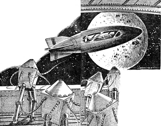 His eyes wandered to the lever at the base of the rocket near one of the stabilizer fins. He must pull the lever and leave quickly. A five-minute interval would elapse before the rocket took off. It was dangerous to remain. He hesitated a moment—then pulled the lever. He did not stay to watch its effect but ran up the stairs into the laboratory and out into the winter night.