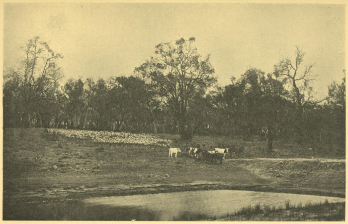 The view from the top of the lighthouse, where we stopped on the way back from a river picnic, is very grand. The rocky Abrolhos, 35 miles away, with the surrounding agricultural country, Champion Bay, and, farther out still, the grand rolling Indian Ocean, make up a most impressive scene. The lighthouse has a revolving white light, brilliantly flashing every 40 seconds, and visible for 16 miles; two other lights, lower down, showing red rays, visible from the north and south. Another day I drove to Greenough Flats, a level and fertile plain, with many fine crops, principally wheat, under cultivation. These flats were, no doubt, in former days vast lagoons, which accounts for the unlimited supply of good underground water. The grass is very nutritious, and the sheep and cattle[331] looked fat. At Minchooka, Mr. Redhead’s station, the stock was looking exceptionally well, and a fine crop of wheat returned 26 bushels per acre from 11 acres. Mr. T. McGuiness, of Greenough Back Flats, lately had a peculiar experience while cleaning out his well, which is 96 feet deep, and was dry. In the hope of obtaining a fresh supply, Mr. McGuiness sank the well 13 feet deeper, and, when driving down his bar, struck water, which spouted up so quickly and with such a rush that he had hardly time to escape drowning; the water rose 30 feet in a very short space of time.