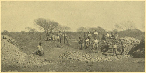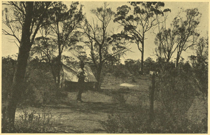 The scenery of this district is far more pleasing than the barrenness of Magnet township. There are plenty of enormous emus scudding through the scrub, and occasionally a few kangaroos enliven the scene. Some of the big hills are completely riddled with enormous holes made by the earthworm. It must have taken centuries to make these tunnels. I thought they must be mining excavations, but one of the mining managers,[324] who is a mining expert and engineer, and who ought to know, told me they were the work of earthworms.