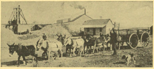Seeing a peculiar-looking place on a hill, I climbed up to see what it was, and found a large hut composed of big flat stones. These stones were lying around in great quantities. Some men were working near, but they were Italians, and as they could not speak English and I could not speak Italian, our conversation was nil. The view from the hill was charming; the salt[321] lakes shimmering in the sun, the flat country with the grass and wild flowers, the low-lying purple hills in the background, a lovely and most peculiar colouring in the sky, the rising stacks of the mines, and the high metaphoric rocks in the distance, formed an uncommon and pretty picture. Just as I was leaving, the sun came out with unusual brilliancy, casting exquisite reflections on the glistening golden sand, which seemed to crystallise into various forms. I almost felt as if I had dropped into fairyland, but in a moment the sun hid behind a cloud and the beautiful scene was gone.