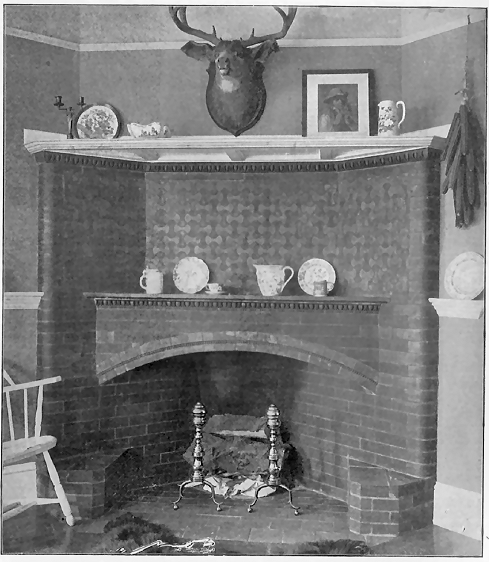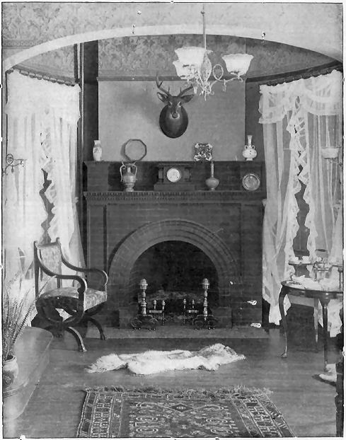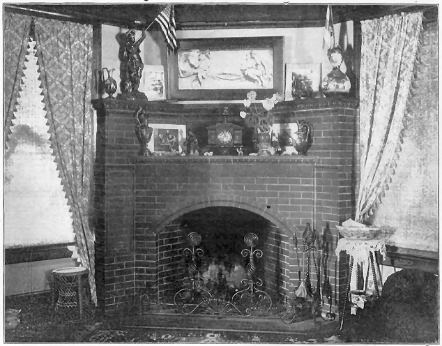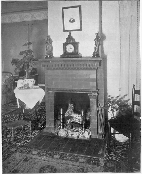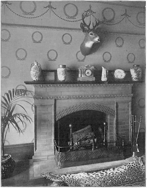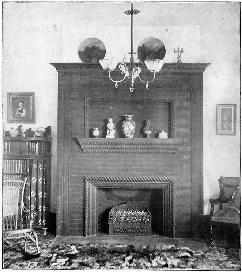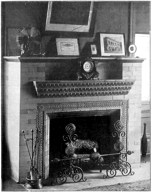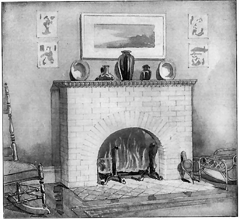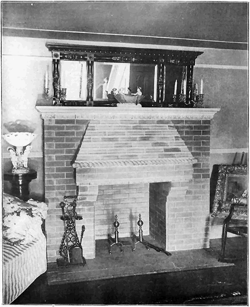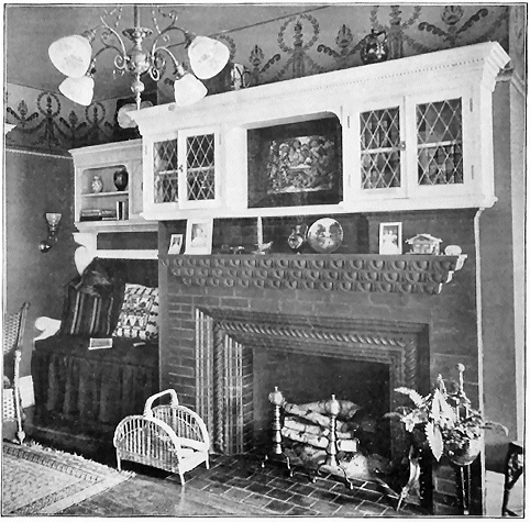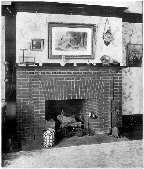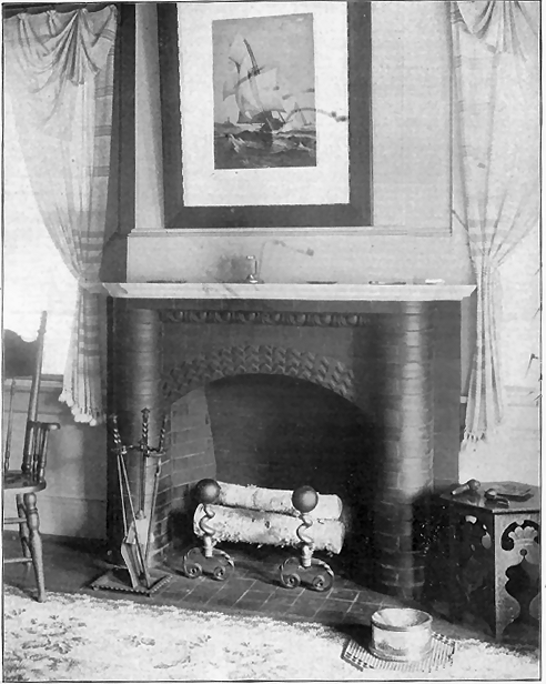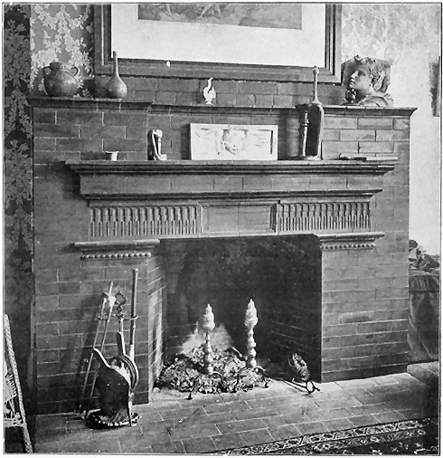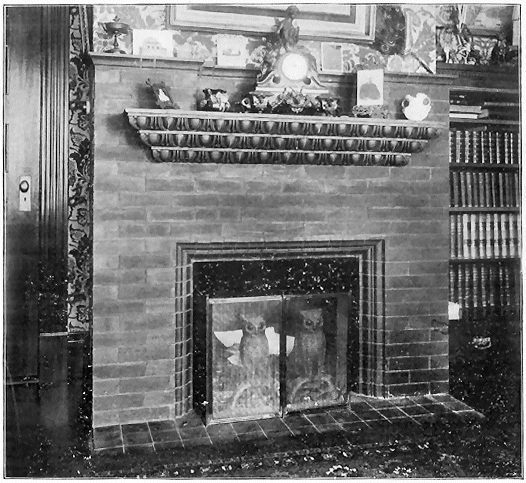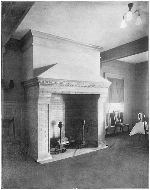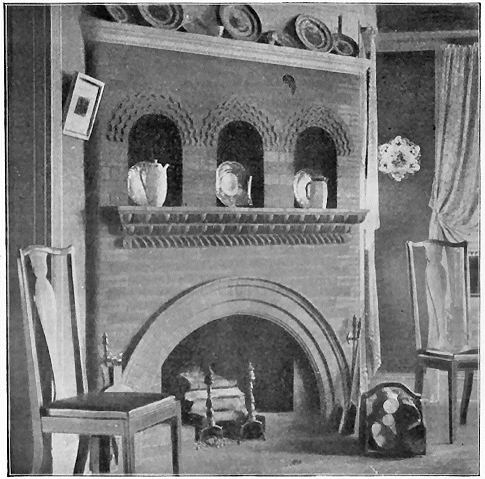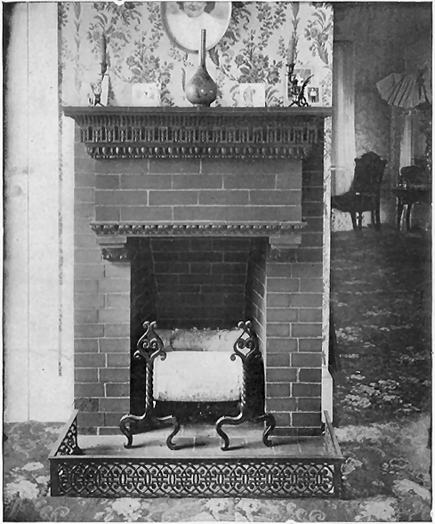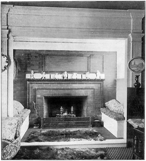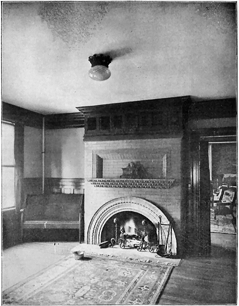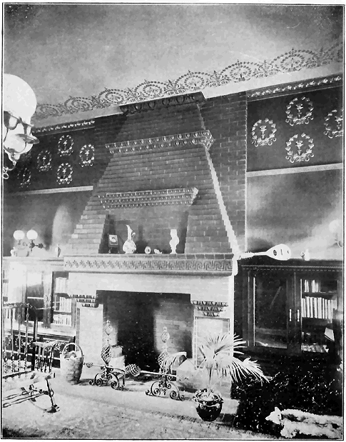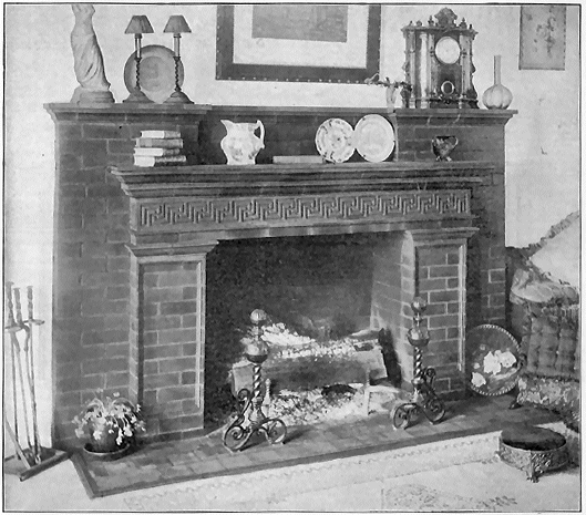 As to the choice of materials for the Fireplace Mantel, nothing has ever been used that meets all requirements so completely as our Ornamental Unglazed Brick. The essential idea of a fireplace is "Brick" from beginning to end, and the practice of using a brick facing with a wooden mantel around it (a practice which is now passing by) has only been a sort of makeshift, employed because Ornamental Brick of new and artistic patterns were not obtainable, our Company being the first to make them. There is always so much woodwork in a room, anyway, so why overcrowd the eye with a "mantelful" more? The glazed tiles which were formerly used in mantels were found to have such a cold, hard, and glassy look that they have been relegated to bathrooms, elevator shafts, sanitary uses, etc., to such an extent that few people now care to consider their use about the fireside.
