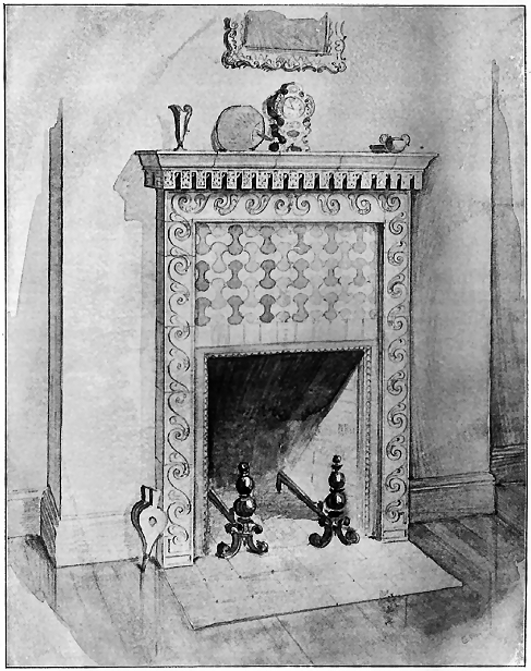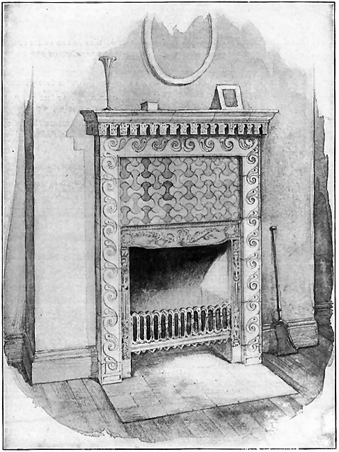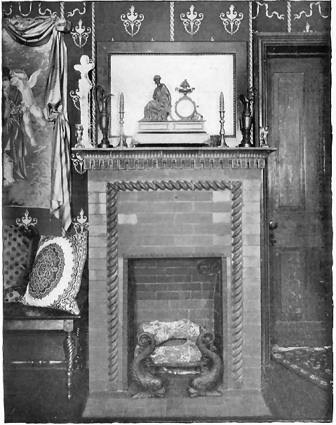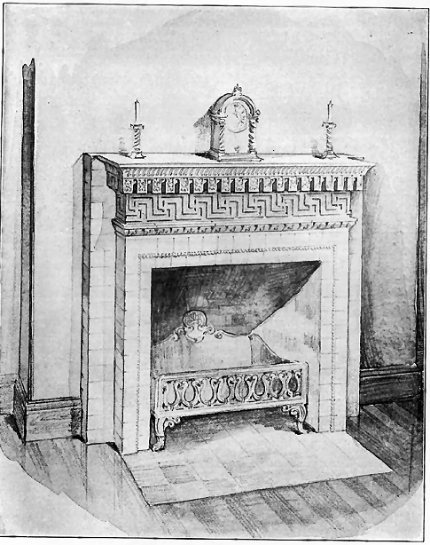 This design would require a width of 7 feet 6 inches, as the arched motif could not be used advantageously in a mantel of more than 8 inches less in width. The cornice to the mantle is of wood.