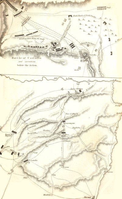 | Operations south of the Tagus—Eroles and Codrington seek to entrap the governor of Taragona—They fail—Sarzfield and Villa Campa unite but disperse at the approach of Pannetier and Severoli—Suchet’s position—Great force of the allies in his front—The younger Soult engages the Spanish cavalry in La Mancha—General Daricau marches with a column towards Valencia—Receives a large convoy and returns to La Mancha—Absurd rumours about the English army rife in the French camp—Some of lord Wellington’s spies detected—Soult is recalled—Gazan assumes the command of the army of the south—Suchet’s position described—Sir John Murray takes the command of the Anglo-Sicilian troops at Alicant—Attacks the French post at Alcoy—His want of vigour—He projects a maritime attack on the city of Valencia, but drops the design because lord William Bentinck recals some of his troops—Remarks upon his proceedings—Suchet surprises a Spanish division at Yecla, and then advances against Murray—Takes a thousand Spanish prisoners in Villena—Murray takes a position at Castalla—His advanced guard driven from Biar—Second battle of Castalla—Remarks | 446 |