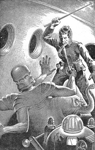 "You'll have to hurry it up," he said quietly, in "spaceal", the lingua franca of deep space. "The ape's aboard and means business. I'm blacking out, I'm afraid, but I've left the lock open for you. Take over, pal!"