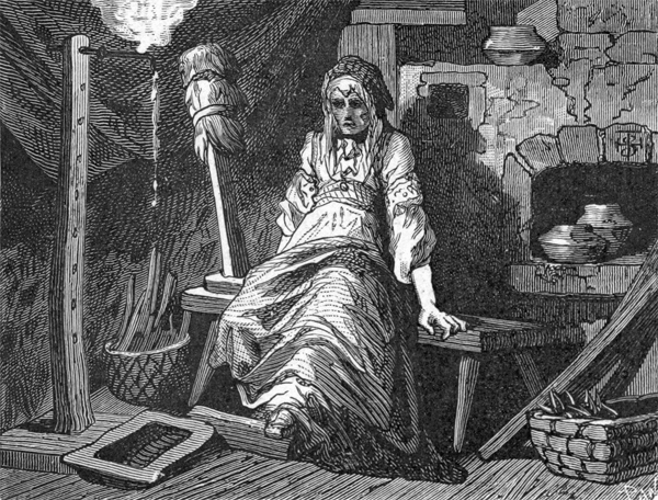 Une vieille femme, coiffée d’un mouchoir brun d’où s’échappaient des flots de beaux cheveux gris, au visage froid et rigide, dans lequel deux grands yeux noirs étincelaient comme des étoiles, dit: