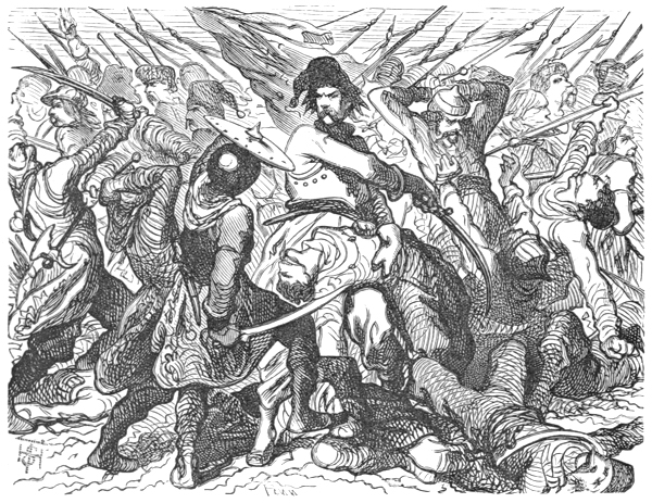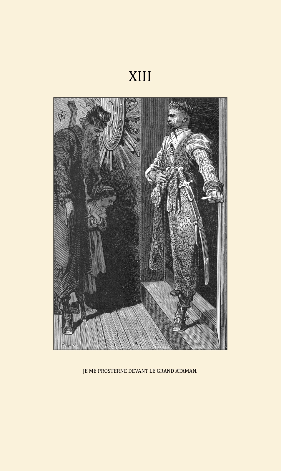 [2] La Setch était une île sur le Dniéper où les cosaques Zaporogues (ce qui veut dire au delà des rapides du Dniéper) tenaient leur camp, où les femmes n’étaient pas admises, et d’où partaient de terribles razzias, principalement sur les terres des Tartares et des Turcs. Gogol en a fait une belle description dans son Tarass Boulba.