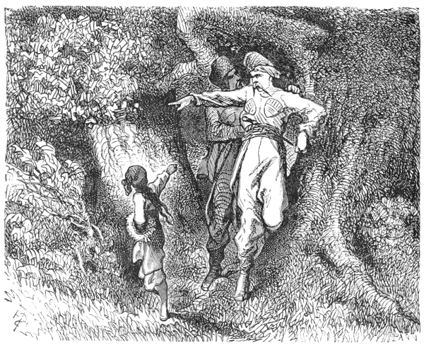 Tout à coup deux bras musculeux écartèrent encore le feuillage. La petite fille, surprise, se jeta devant son grand ami qu’elle croyait menacé.