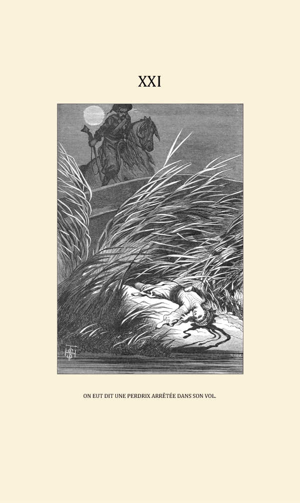 Maroussia repartit; de fatigue il n’était plus question, son ami l’avait désiré; elle avait des ailes. Le champ de sarrasin est dépassé, voici le petit pont, elle y dépose ses deux couronnes. Un bruit sourd avait frappé son oreille. Elle écoute, le bruit se rapproche et se fait sonore. Ce doit être celui d’un cheval lancé au galop. Le cavalier est-il un ami ou un ennemi? Ce n’est pas un Cosaque. De loin on dirait un Tatare. Quand elle voyageait avec le vieux rapsode, ils évitaient toujours ces Tatares. Elle revient sur ses pas, repasse le pont. C’est égal, les couronnes y sont, c’est autant de fait. Maroussia est contente. Elle va se cacher dans les joncs. Le cavalier arrive à bride abattue; l’aurait-il aperçue? Elle espère que non. Mais à peine Maroussia avait-elle fait quelques pas à travers ces joncs qui poussaient au bord du ruisseau, qu’un coup de feu était parti. Le mouchoir rouge, ainsi que la jolie tête qu’il recouvrait, était tombé au milieu des roseaux. On eût dit une perdrix arrêtée dans son vol.