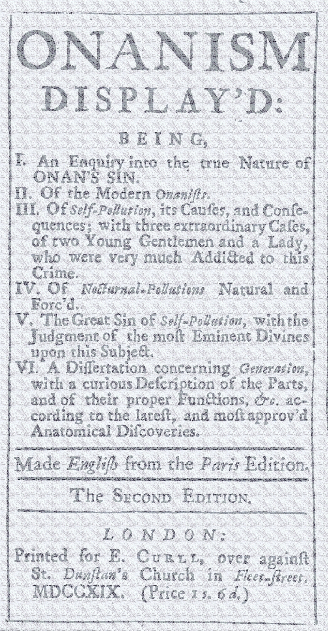 The Author of a late Pamphlet entitled Onania has by a Bundle of Theological Phrases, Scripture Quotations, and an affected Simplicity, attempted to possess the World with an Opinion, that his Designs in publishing that Treatise, were meerly with spiritual Views, and out of a tender regard to the preservation of the Healths and Constitutions of the degenerate part of Mankind, without 2any the least Mercenary Expectations; and since it may possibly bear this Construction with Persons carelesly perusing his Performance, and the ignorant Multitude: I shall make it my Business to set forth the Absurdity, inconsistency, and imposture of this supercilious Scribler in every part; to prove that his Treatise tends to the encouragement of Lewdness and Debauchery; that his own Medicines promote the very Sin, he, for Interest sake, takes upon him to Discountenance; and to demonstrate, that he is really ignorant of what was the Crime of Onan. But I shall premise that my Scheme is no ways calculated to propagate any manner of Uncleanness, but on the contrary to discourage the practice of self-pollution, by illustrating the Sin more particularly; and enumerating more extraordinary Instances than hitherto any Author has done on the Subject.