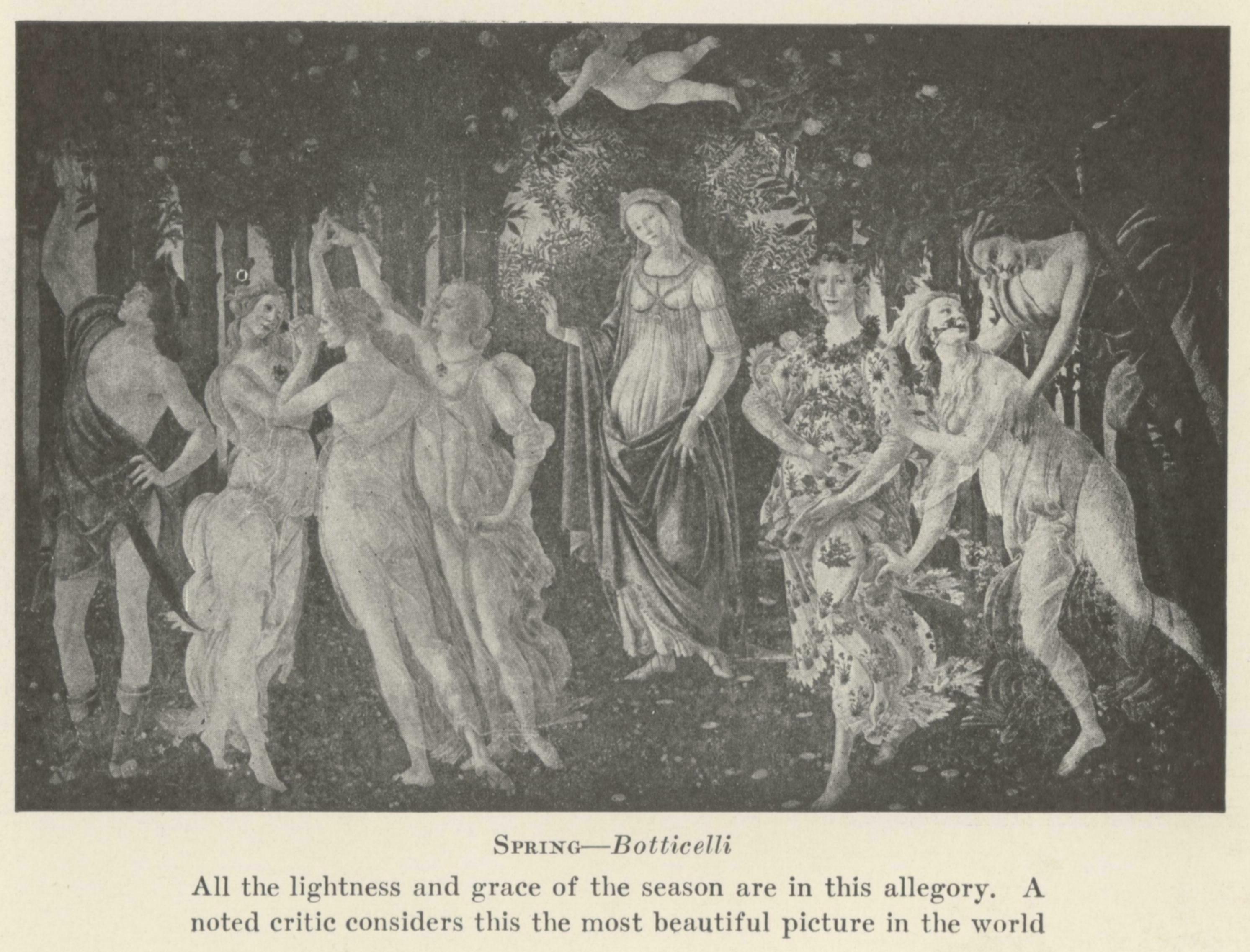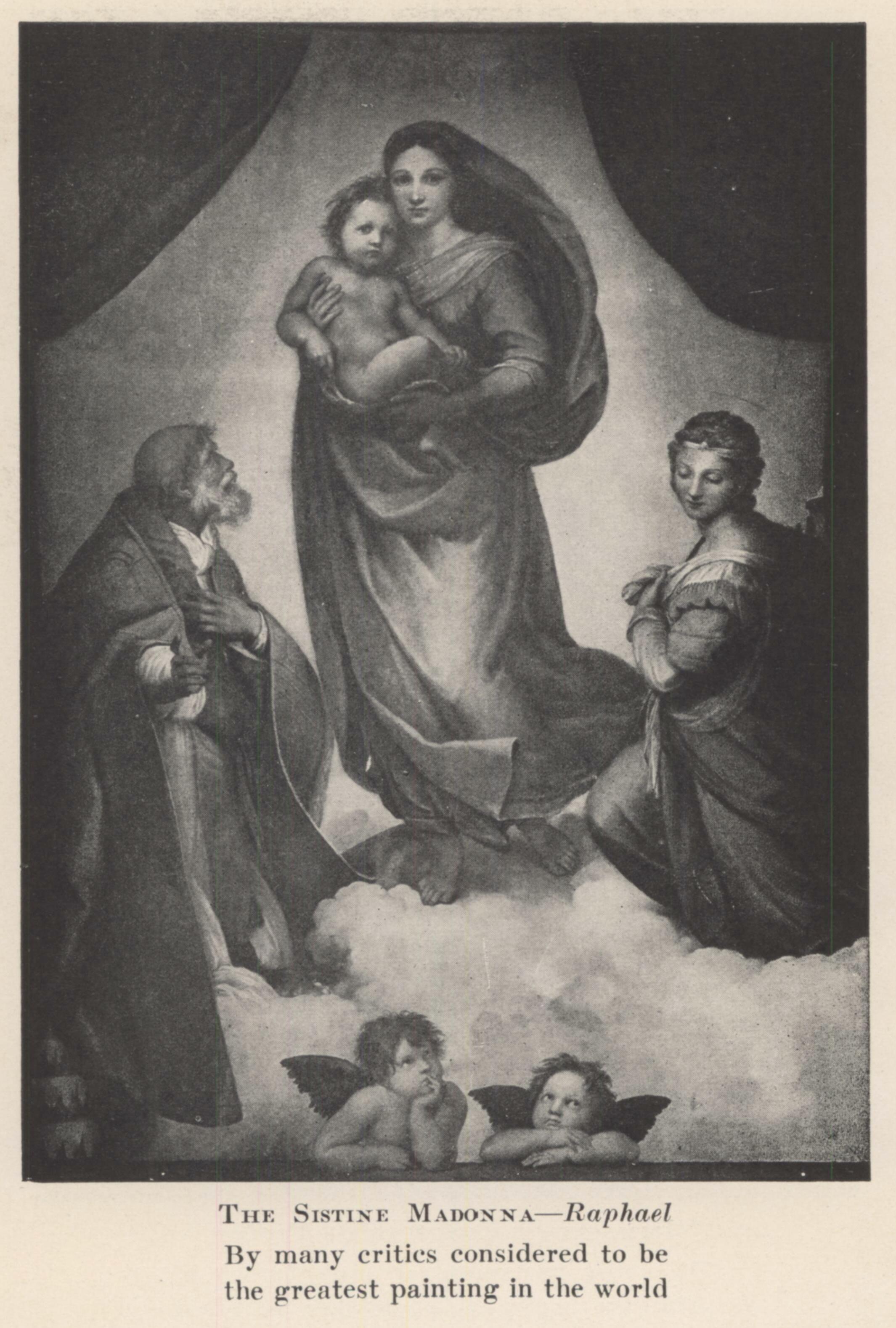 The true art-lover has a catholic taste, is interested in all forms of art; but he finds beauty where it truly exists and does not allow the nightmare of imagination to mislead him. That which is not beautiful from one point of view or another is not art, but decadence. That which is technical to the exclusion of other elements remains technique pure and simple, workmanship--the bare bones of art. A thing is not art simply because it is fantastic. It may be interesting as showing to what degree some imaginations can become diseased, but it is not pleasing nor is it art. There are fully a thousand pictures that every child should know, since he can hardly know too much of a good thing; but there is room in this volume only to acquaint him with forty-eight and possibly inspire him with the wish to look up the neglected nine hundred and fifty-two.