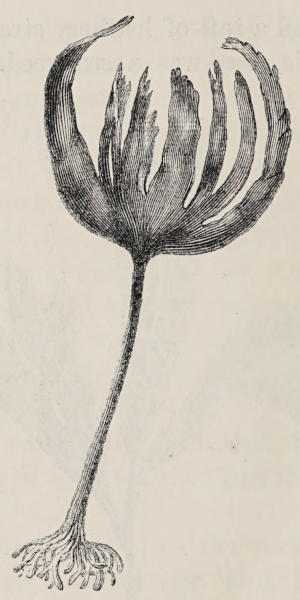 Mr. Miller pointed to the rocks, some of which were covered with long bunches of tangled stems of a dark-brown or green colour, which he said were sea-weeds. Some stout stems were also lying about the shore, like horse-whips, with a bunch of roots at[19] one end, and a tuft of leathery straps at the other. This, too, was a sea-weed. He reminded him, too, of a book which he had seen at home, filled with crimson, purple,[20] green, and brown leaves, which he said were also sea-weeds. They do not send their[21] roots into the ground like garden weeds, but cling to the rocks or to each other, and are nourished by the water in which they grow.