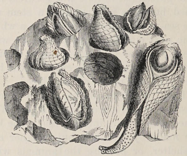 “I once came here when the water was low, and as I stepped from rock to rock I broke off several pieces with my foot. The animals were then in them and alive. They are about the size and shape of a horse-bean; they have, like oysters, two shells, which are rough, and of a dull yellow colour. There is another kind of shell-fish, larger than this, which burrows in rocks, named pholas.”