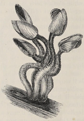 The next thing picked up was a piece of cork, covered with barnacles. Barnacles are small shell-fish, growing on long leathery stems, by which they fasten themselves to[38] floating wood, or the bottoms of vessels. They are not so mischievous as the worms mentioned before, as they do not actually eat the wood; but when, as is sometimes[39] the case, they thickly cover the bottom of a ship, they prevent it from going quickly through the water. It is sometimes found necessary to take a ship into a dock, in order to scrape off the barnacles.