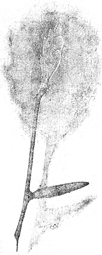 Die beste Zeit darnach zu suchen, ist am Ende des Winters, wenn der Baum kahl ist. Zuerst sieh die kleineren Knospen an, die zu zwei und zwei einander am Zweige gegenüberstehen. Unter jeder Knospe sieht man eine Narbe, die die Stelle bezeichnet, wo das Blatt im letzten Jahre wuchs. Die Narbe hat die Form eines Pferdehufes und hat verschiedene schwarze Flecke, die wie die Nägel angeordnet sind. Diese Stellen zeigen, wo die Röhrenbündel waren, die den Saft in das Blatt führten.