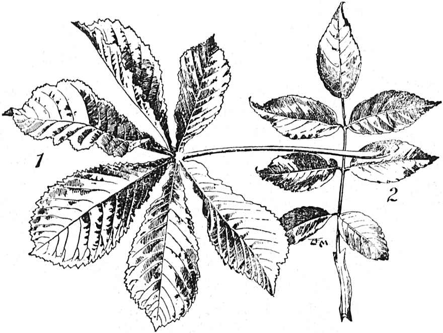 Blätter, die in verschiedene Teile zerschnitten sind, so daß man einen abreißen kann, ohne die anderen zu berühren, heißen zusammengesetzte. Die Blätter der Roßkastanie, Esche, Rose, des Vogelbeerbaumes und des Holunders sind zusammengesetzt. Ihr müßt euch ins Gedächtnis zurückrufen, daß die Abteilungen Blattabschnitte und nicht Blätter sind, weil sie am Ende keine wachsende Spitze und im Blattwinkel keine Knospen haben. Die Blättchen wachsen aus der Spitze des Blattstengels heraus (Roßkastanie) oder aus der schmalen grünen Mittellinie (Rose), die nicht der Stengel, sondern die Mittelrippe des Blattes ist.