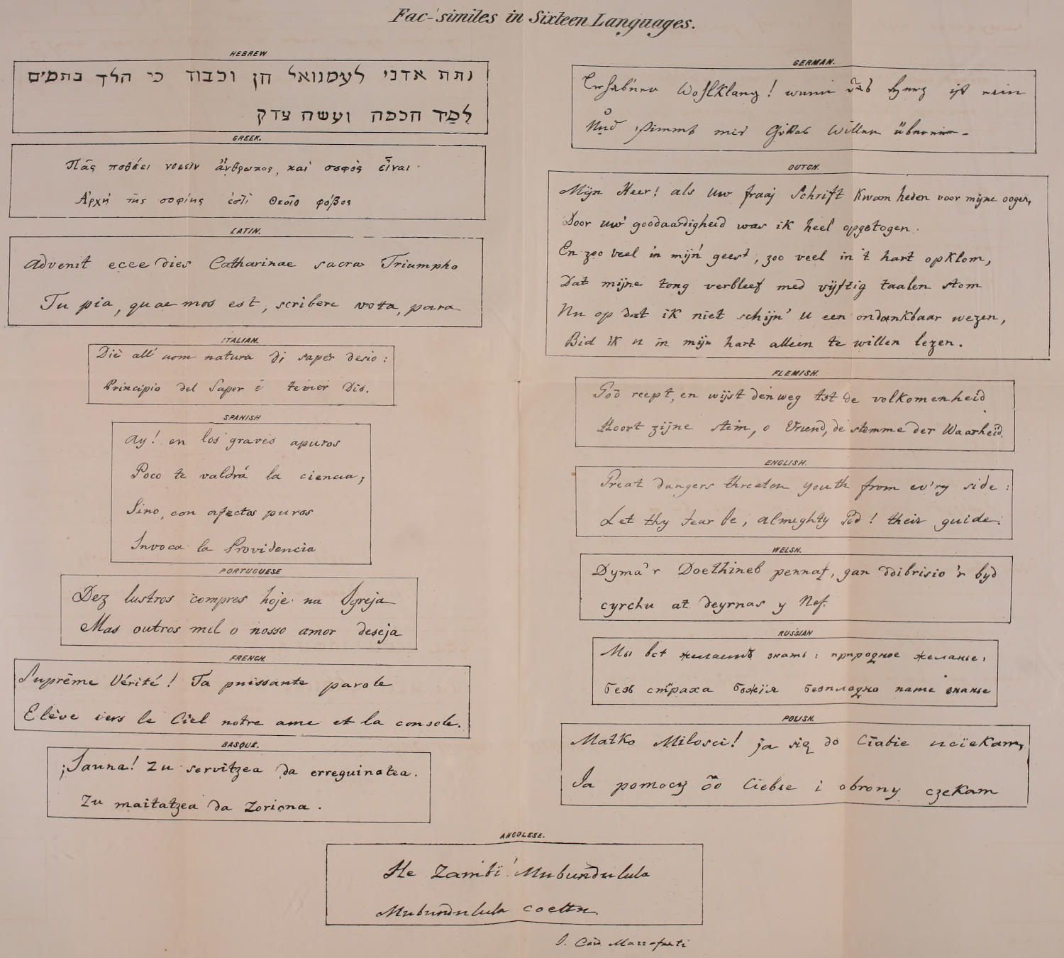 [525] These were (1,) Hebrew; (2,) Syriac; (3,) Samaritan; (4,) ancient Chaldee; (5,) Modern Chaldee; (6,) Arabic; (7,) ancient Armenian; (8,) modern Armenian; (9,) Turkish; (10,) Persian; (11,) Albanian; (12,) Sabean;—a dialect of Syriac, which Adelung prefers to call Zabian;—(13,) Maltese; (14,) Greek; (15,) Romaic; (16,) Ethiopic; (17,) Coptic; (18,) Amariña; (19,) Tamul; (20,) Koordish; (21,) Kunkan,—one of the dialects of the Bengal coast;—(22,) Georgian; (23,) Welsh; (24,) Irish; (25,) Gælic; (26,) English; (27,) Illyrian; (28,) Bulgarian; (29,) Polish; (30,) Peguan; (31,) Swedish; (32,) ancient German; (33,) modern German; (34,) Swiss German; (35,) Dutch; (36,) Spanish; (37,) Catalan; (38,) Portuguese; (39,) French; (40,) ancient Chinese; (41,) Chinese of Tchang-si; (42,) Chinese of Canton.