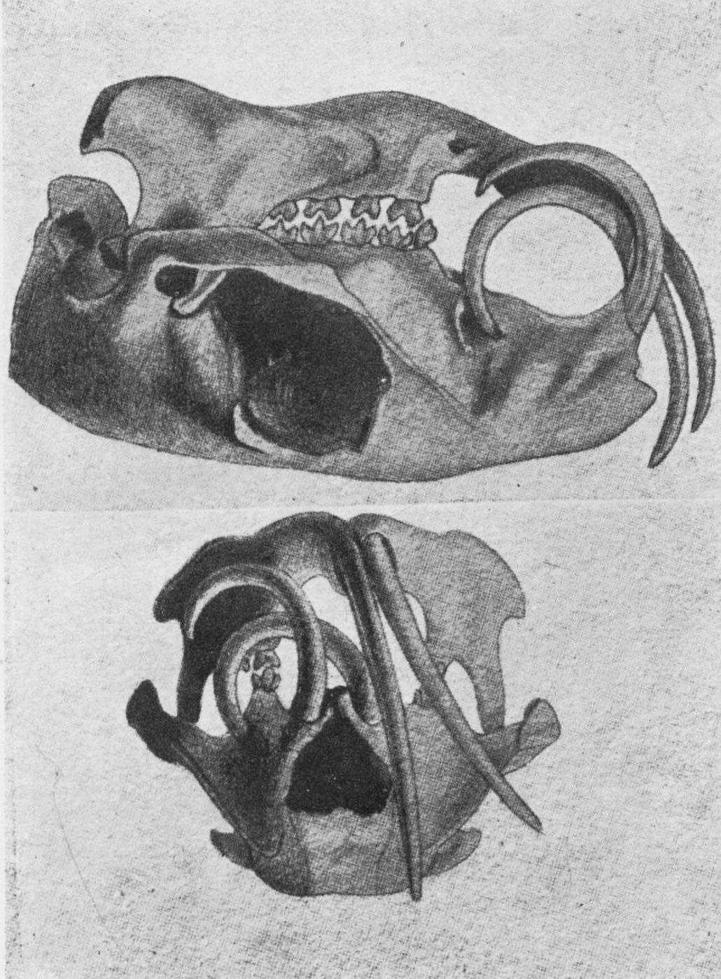 One would hardly think that marmots ever fed each other, yet a skull in my collection makes me wonder how this particular animal, an old beast, can have survived without receiving nourishment from its fellows. It was shot near St. Gallenkirch in the Montavon valley on September 12th, 1886; and is remarkable since, in consequence of what looks like the fracture of a single incisor tooth, the lower jaw has been partially and slowly displaced, shifted to one side of the upper—at the cost, no doubt, of incessant pain. What happened? All four incisors therewith became not only useless but an intolerable{10} hindrance; lacking the necessary attrition, they grew ever longer in mammoth-like curves, and sharply pointed; the shortest—the injured one, which is still deprived of enamel at its extremity—measures six and a half centimeters in length, the longest all but eight; and one of them, in the course of its circular development, has actually begun to bore into the bone of the upper jaw. I am not much of a draftsman, but these two sketches will suffice to give some idea of the freak specimen. A squirrel with somewhat similar dentition was described in the “Zoologist” (Vol. IX, p. 220). Here was one marmot, at least, who must have been glad when summer food-problems were over, and it grew cold enough to scuttle downstairs again for a six months’ rest. And some of them sleep in this fashion for eight months on end. What a sleep! Why wake up at all?