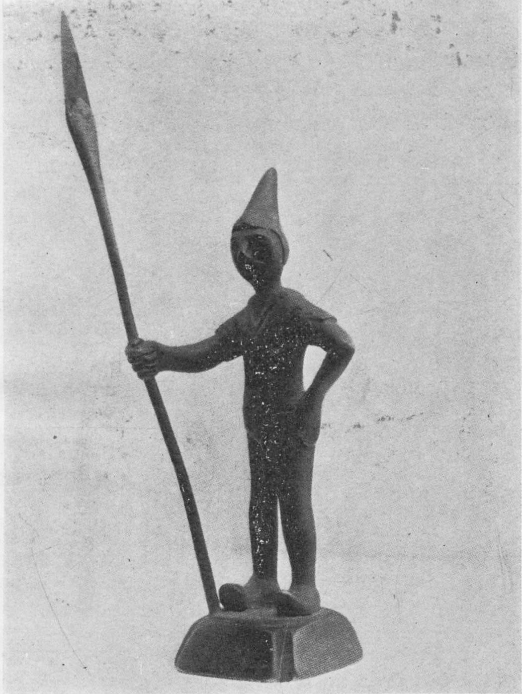 [24] He speaks of our primitive lake-dwellers as being of a different race and anterior to these—a race that can be proved none the less to have lingered into the Roman period; which makes him wonder why there is no mention of them in Latin writers, whereas Herodotus has left us such an excellent description. (There is a hint of them in Cæsar’s account of the Britons; and a representation, on Trajan’s Column, of what might be a Dacian palafitte.) Sundry objects of this epoch have been found at our end of Lake Constance. To other evidence showing that the inner Walgau, the Ill valley between Feldkirch and Bludenz, was at one time also or at least partially a lake, I can add a small confirmatory fact, namely, the discovery by myself, on the 13 October, 1883, of one of those spindle-whorls of burnt clay—unornamented, this one—which are characteristic of the lacustrine era. I drew it out of the earth in the then fresh railway cutting below the convent of St. Peter at Bludenz, and take some little credit to myself for detecting it, and realizing its significance, at that tender age. I know not whether other relics of lake-dwellers have been found up here; this one specimen is sufficient evidence of their existence for me. It is worth noting, too, that not a single old village of the inner Walgau lies in the plain (which may also be due to fear of Ill floods). My contribution to the antiquities of later periods consists of the statuette here figured. It was found not far from Lauterach during those Rhine-regulation works mentioned on p. 54, and I was obliged to give its owner a diamond scarf-pin which had cost me £65—those were opulent days—before he could be induced to part with it. The material is bronze, all except the iron lance-blade and rivetings under the feet; its height, to the tip of the lance, is 17½ centimeters. Every detail in this little work of art is challenging, and I will not lose myself in conjectures as to its age or origin.