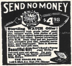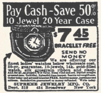 Here’s your only opportunity to get this elegant high grade thin model watch with choice of gold, silver, radium, or fancy engraved dial for only $3.30 C. O. D. Open face, stem wind and set. Adjusted. Fully tested. Guaranteed perfect timekeeper. A watch you’ll be proud to own.