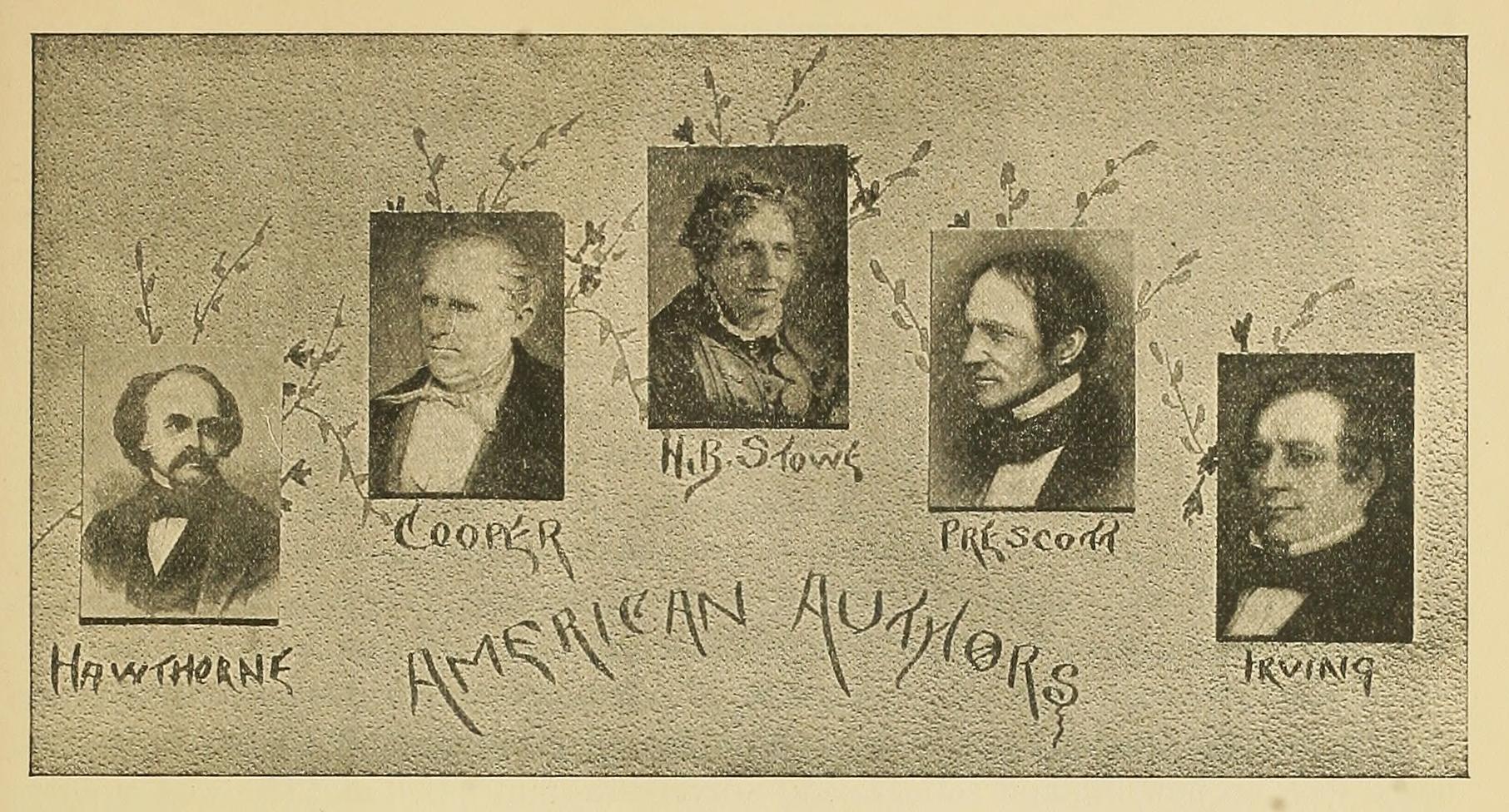 Special attention has been given to illustrations. We have inserted portraits of all the authors whose photographs we could obtain, and have, also, given views of the homes and studies of many. A large number of special drawings have also been made to illustrate the text of selections. The whole number of portraits and other illustrations amount to nearly one hundred and fifty, all of which are strictly illustrative of the authors or their writings. None are put in as mere ornaments. We have, furthermore, taken particular care to arrange a number of special groups, placing those authors which belong in one class or division of a class together on a page. One group on a page represents our greatest poets; another, well-known western poets; another, famous historians; another, writers for young people; another, American humorists, etc. These groups are all arranged by artists in various designs of ornamental setting. In many cases we have also had special designs made by artists for commemorative and historic pictures of famous authors. These drawings set forth in a pictorial form leading scenes in the life and labors of the author represented.